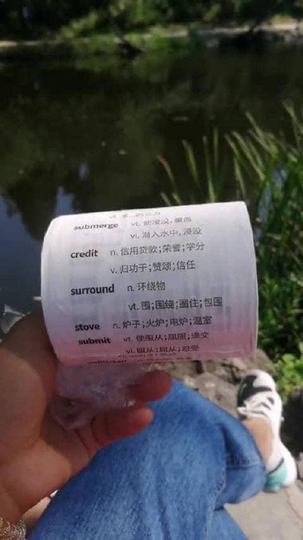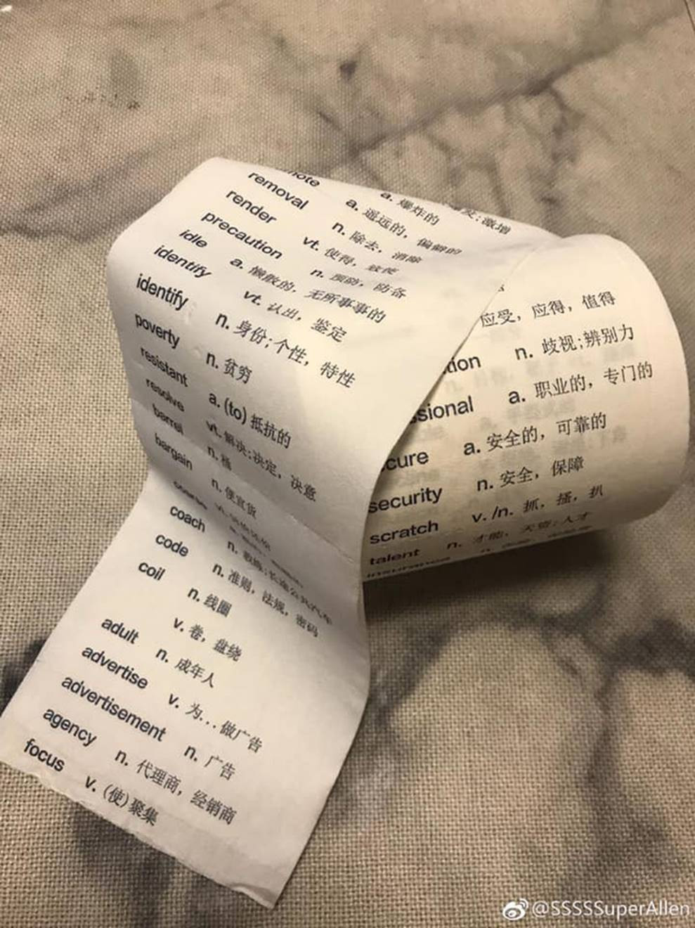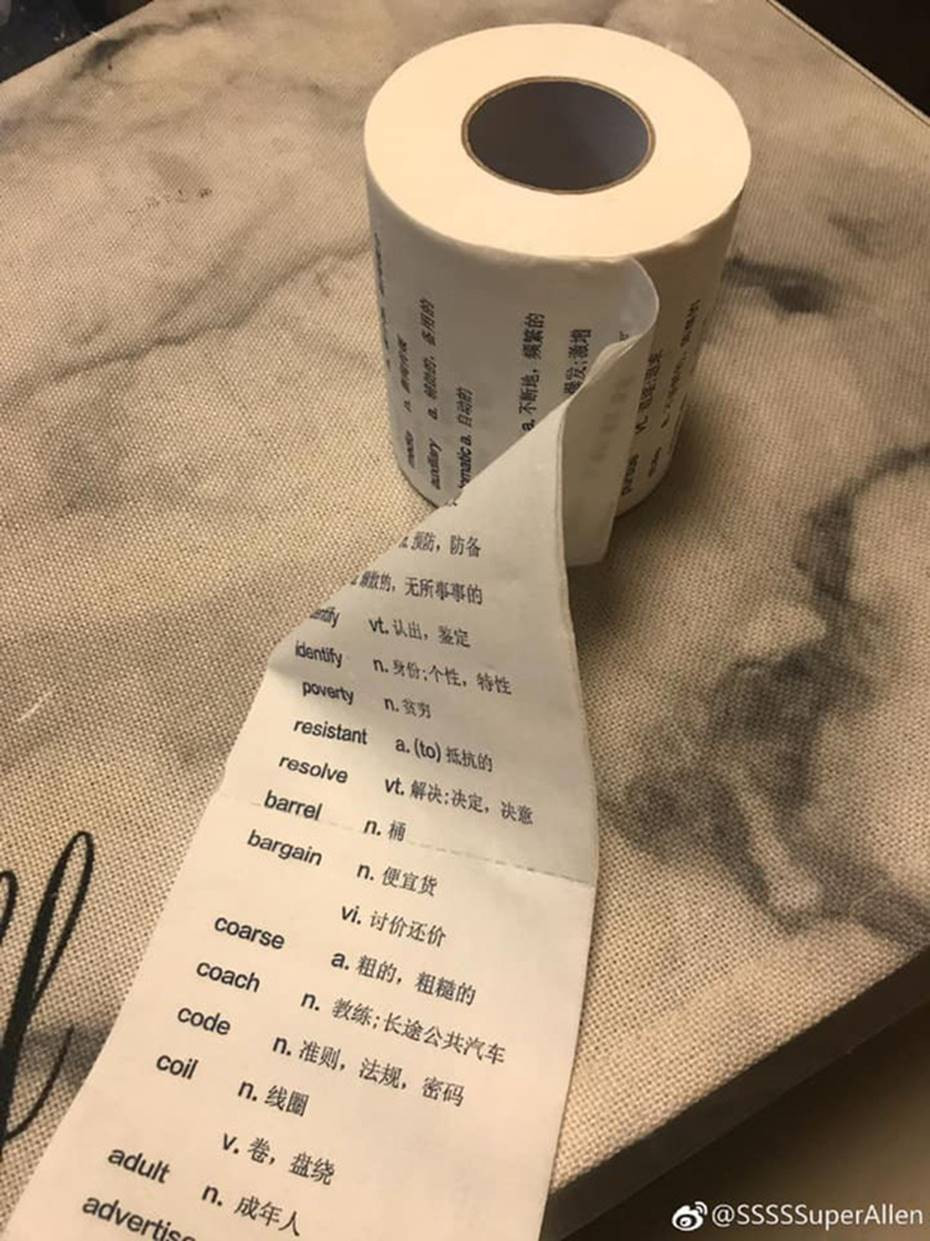 Để khắc phục tình trạng sinh viên dốt tiếng Anh như hiện nay, một trường Đại học tại Trung Quốc đã nảy ra ý tưởng in các từ vựng lên cuộn giấy vệ sinh, nhằm cho các cô cậu học trò ôn luyện lúc "làm chuyện ấy".