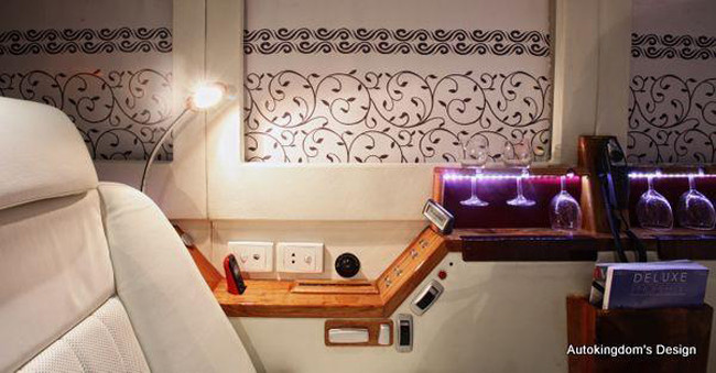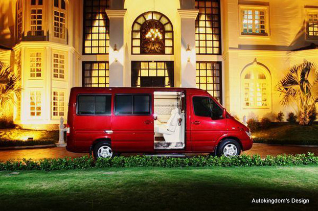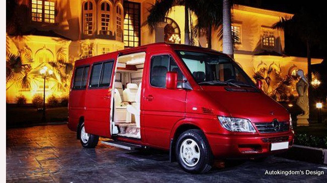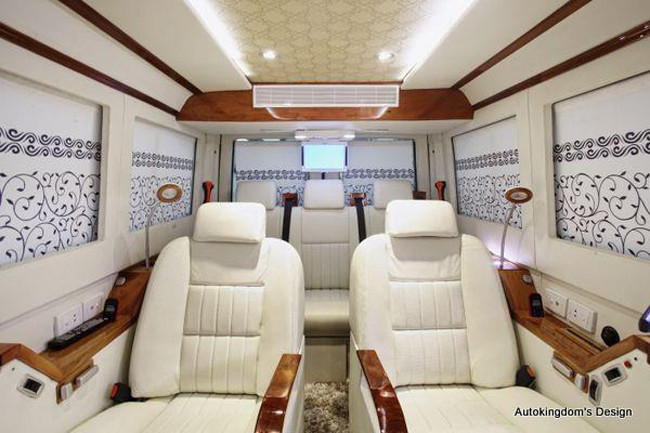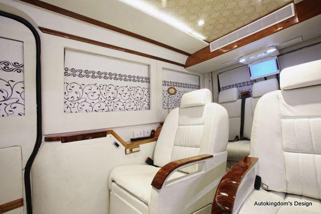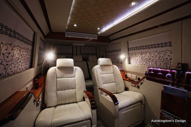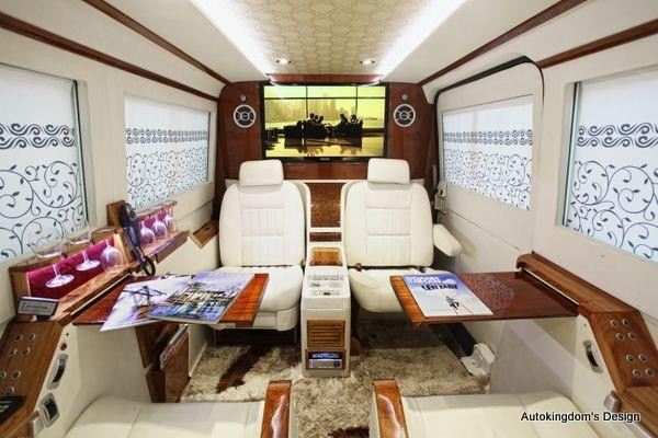 Được biết, dưới bàn tay của các kỹ sư Việt, chiếc Mercedes Sprinter 313 16 chỗ đã được tiêu biến còn 10 chỗ ngồi, 3 chỗ phần khoang tài xế và 7 chỗ ở phía sau. Ngoài việc thay đổi số ghế ngồi, chiếc limousine đặc biệt này còn được trang bị không gian nội thất vô cùng sang trọng đúng nghĩa. Có thể thấy toàn bộ nội thất được bao phủ bằng hình ảnh sinh động và bắt mắt. Bên cạnh đó là thảm sàn, bàn nhỏ tiện dụng và một chiếc TV để hành khách thoải mái giải trí. Nội thất của chiếc xe còn được trang bị thêm cửa tự động, tủ lạnh, dàn âm thanh, ốp gỗ... cao cấp.