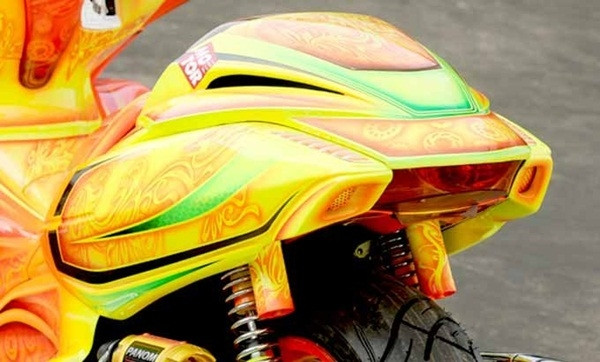 Phần phuộc xe cũng được phun sơn và họa tiết rực rỡ.