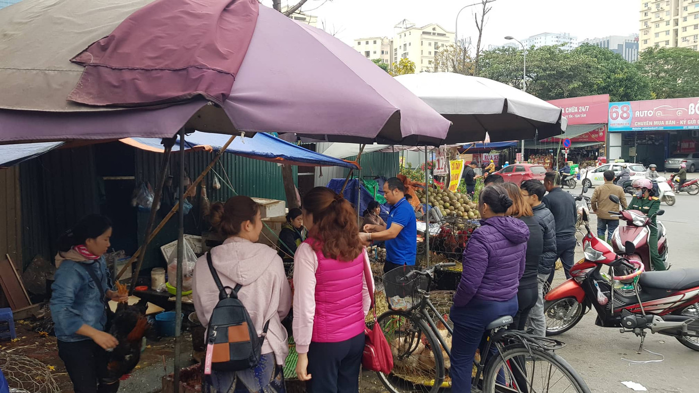 Khách xếp hàng từ sáng sớm chờ mua gà tại chợ Trung Văn (Nam Từ Liêm, Hà Nội). Chị Thu Nga (tại khu Trung Văn) cho biết, chị đưa con đi học lúc 7giờ 30 sáng rồi đi mua gà cúng nhưng đi đến 5 cửa hàng gà đều đông khách. Nhìn cảnh chờ đợi quá lâu nên chị tiếp tục đi các sạp hàng gà khách tìm mua cho nhanh. Đến sạp gà thứ 6 chị phải chờ 45 phút mới mua được gà thịt sẵn và muộn giờ làm đến cơ quan.