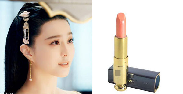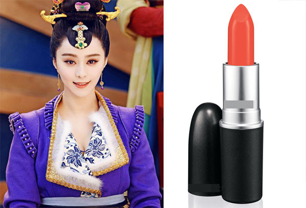 Son cam pha chút đỏ là sắc màu quý phái, phù hợp với mọi màu da, lứa tuổi, đặc biệt là với những người sở hữu nước da trắng mịn như Phạm Băng Băng. Ngoài việc lựa chọn các tông son phù hợp với từng giai đoạn lịch sử trong phim, Hoa đán còn thường xuyên tô son bóng để tăng cảm giác bờ môi thêm đầy đặn, căng mọng.