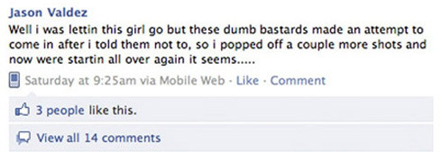 Cuối tháng 6, Jason Valdez, 36 tuổi, khống chế một phụ nữ làm con tin trong căn phòng ở Ogden, Utah (Mỹ). Cảnh sát đã bao vây và thương lượng suốt 16 tiếng trước khi họ quyết định xông vào. Đáng lẽ, đây chỉ là một vụ bắt giữ như bao vụ khác, trừ một việc: Valdez liên tục đăng status lên Facebook trong suốt cuộc đối đầu với cảnh sát từ việc bị ngắt nguồn điện cho đến chuyện vừa bắn vài phát...