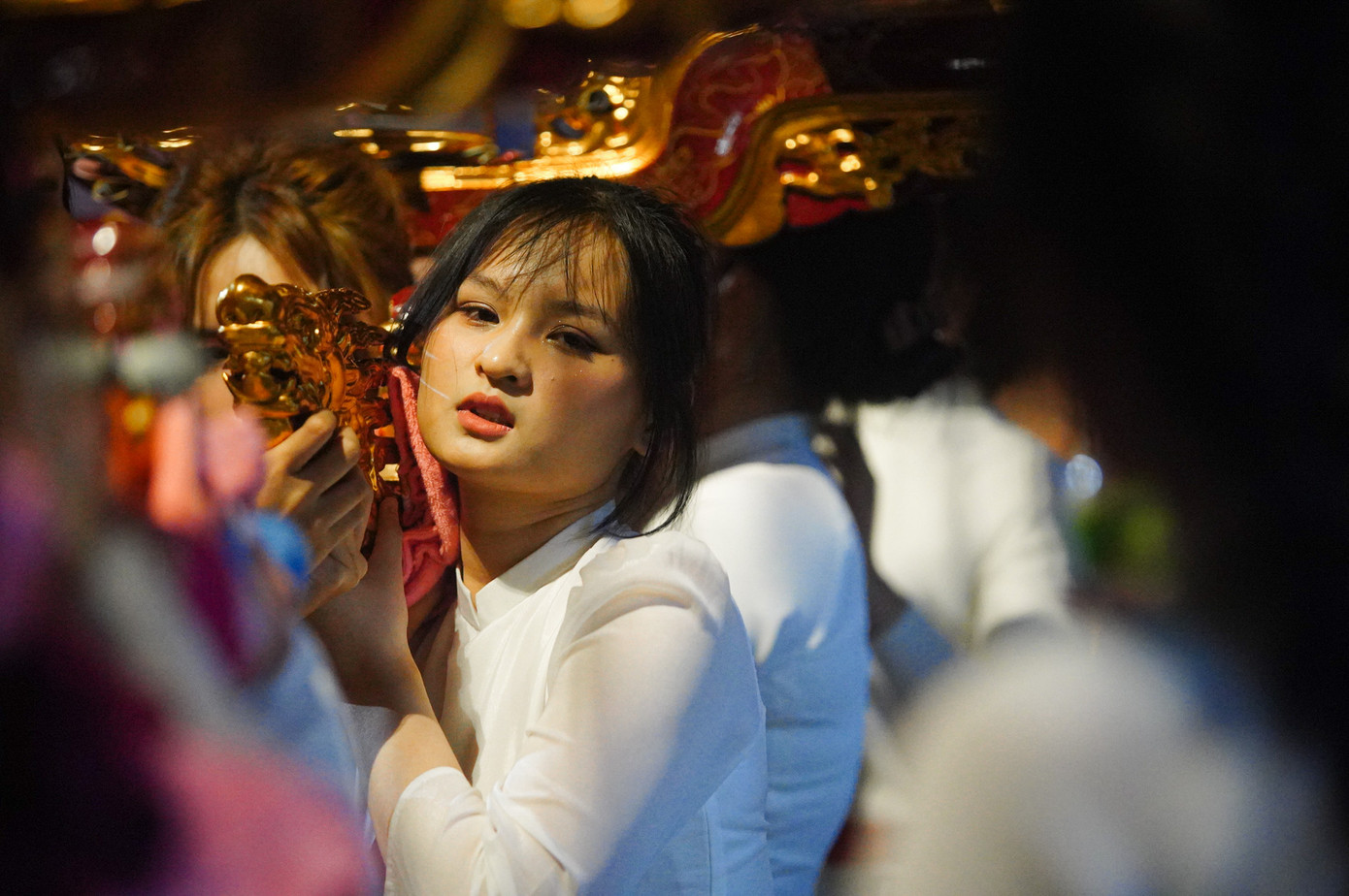 Các thiếu nữ trong trang phục trắng cố giữ thăng bằng cho kiệu.