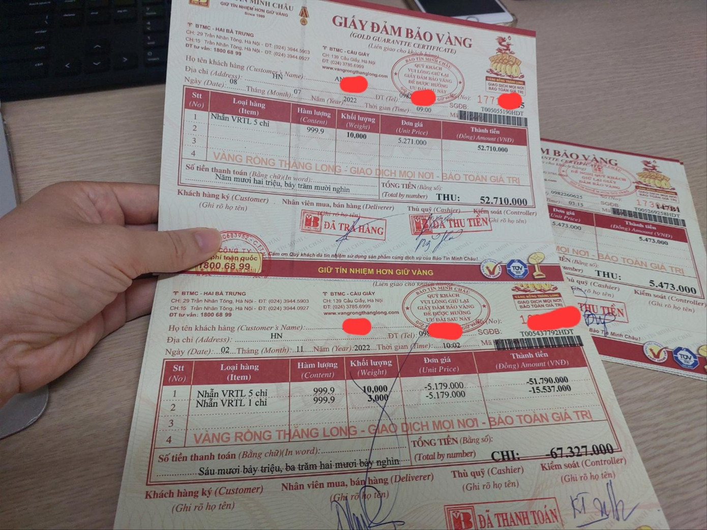 Nhiều khách hàng khi mua vàng tại Bảo Tín Minh Châu cũng cho biết, chỉ nhận được giấy đảm bảo vàng, không có hoá đơn. Chỉ khi nào khách hàng yêu cầu xuất hoá đơn, để lại thông tin cá nhân, mã số thuế, nhân viên của Bảo Tín Minh Châu mới xuất hoá đơn mua bán vàng.