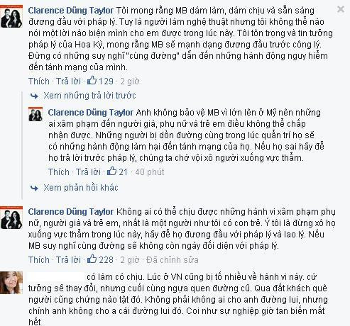 Đồng thời, Dũng Taylor bày tỏ: "Tôi mong rằng Minh Béo dám làm, dám chịu và sẵn sàng đương đầu với pháp lý. Tuy là người làm nghệ thuật nhưng tôi không thể nào nói một lời nào biện mình cho em được trong lúc này. Tôi tôn trọng và tin tưởng pháp lý của Hoa Kỳ, mong rằng Minh Béo sẽ mạnh dạn đương đầu trước công lý. Đừng có những suy nghĩ "cùng đường" dẫn đến những hành động nguy hiểm đến tánh mạng của mình".
