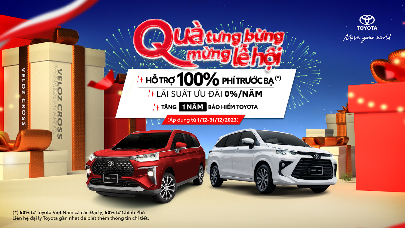 Tháng 12, mùa cao điểm mua sắm đã tới, Toyota Việt Nam tiếp tục duy trì chương trình khuyến mại cực kỳ hấp dẫn cho khách hàng khi hoàn tất thủ tục thanh toán mua xe Veloz Cross và Avanza Premio từ nay tới hết ngày 31/12/2023.