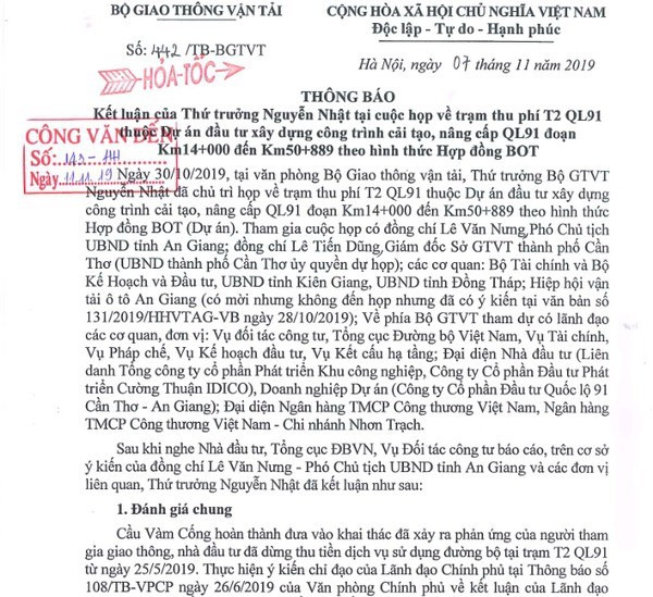 Để có cơ sở báo cáo Thủ tướng Chính phủ về phường án xử lý trạm thu phí T2, Bộ GTVT đề nghị Ban quản lý dự án Thăng Long, nhà đầu tư khẩn trương hoàn thành công tác quyết toán toàn bộ dự án trong tháng 11/2019. Giao Vụ Tài chính chủ trì quyết toán giá trị hoàn thành làm cơ sở xác định chi phí đầu tư dự án và xác định lại thời gian thu tiền dịch vụ sử dụng đường bộ dự án, đặc biệt là quyết toán đoạn QL91B, kịp thời báo cáo Bộ GTVT các vướng mắc nếu có để xử lý…