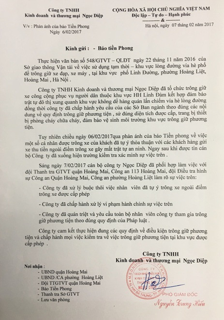 Chiều 8/2 lãnh đạo Cty Ngọc Diệp là ông Nguyễn Trung Hiếu, Phó giám đốc Cty đã gửi văn bản đến báo Tiền Phong cho biết, Cty đã được Sở GTVT cấp phép sử dụng đường phố để trông giữ xe tại khu vực phố Linh Đường.