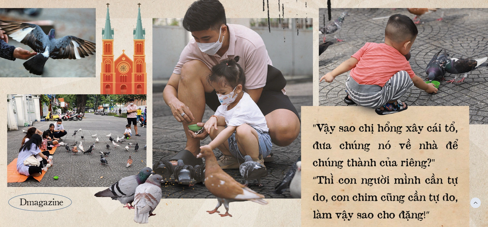 Cứ thế, hơn 10 năm nay, chị Thanh và nhiều người dân ở quanh Nhà thờ Đức Bà bỗng chốc trở thành "bảo mẫu" bất đắc dĩ của đàn bồ câu. Một điều đặc biệt hơn, ngày ngày họ cho chúng ăn, hiểu tính nết từng đứa, chăm nom như con, nhưng chưa bao giờ mảy may suy nghĩ sẽ sở hữu chúng. Và ngay cả khi tôi lên tiếng muốn viết bài báo tôn vinh công việc thầm lặng này, chị Thanh vẫn từ chối chụp ảnh, chỉ muốn viết về đàn bồ câu để người dân thành phố nâng cao ý thức bảo vệ động vật hoang.
