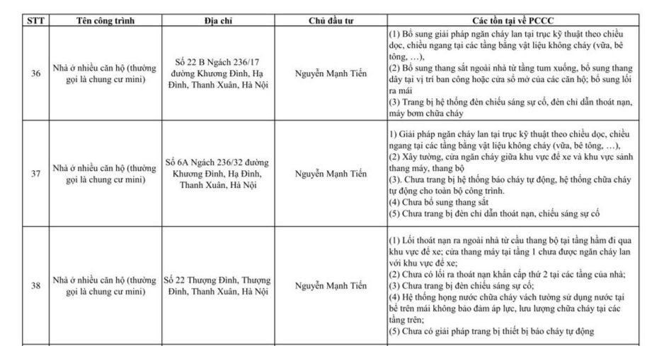 Đáng chú ý, theo danh sách mà Công an quận Thanh Xuân công bố, tại ngõ 236 Khương Đình, chủ đầu tư của CCMN 22B, ngách 236/17 là ông Nguyễn Mạnh Tiến cũng là chủ đầu tư của công trình chung cư mini số 6A ngách 236/32 Khương Đình vi phạm quy định về PCCC như: Giải pháp ngăn cháy lan tại trục kỹ thuật theo chiều dọc, chiều ngang tại các tầng bằng vật liệu không cháy (vữa, bê tông); Xây tường, cửa ngăn cháy giữa khu vực để xe và khu vực sảnh thang máy, thang bộ; Chưa trang bị hệ thống báo cháy tự động, hệ thống chữa cháy tự động cho toàn bộ công trình; Chưa bổ sung thang sắt; Chưa trang bị đèn chỉ dẫn thoát nạn, chiếu sáng sự cố.