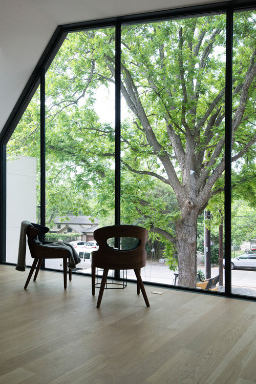 Phòng ngủ có cảm giác mát mẻ nhờ hướng nhìn ra cây cổ thụ trước sân và đường phố.