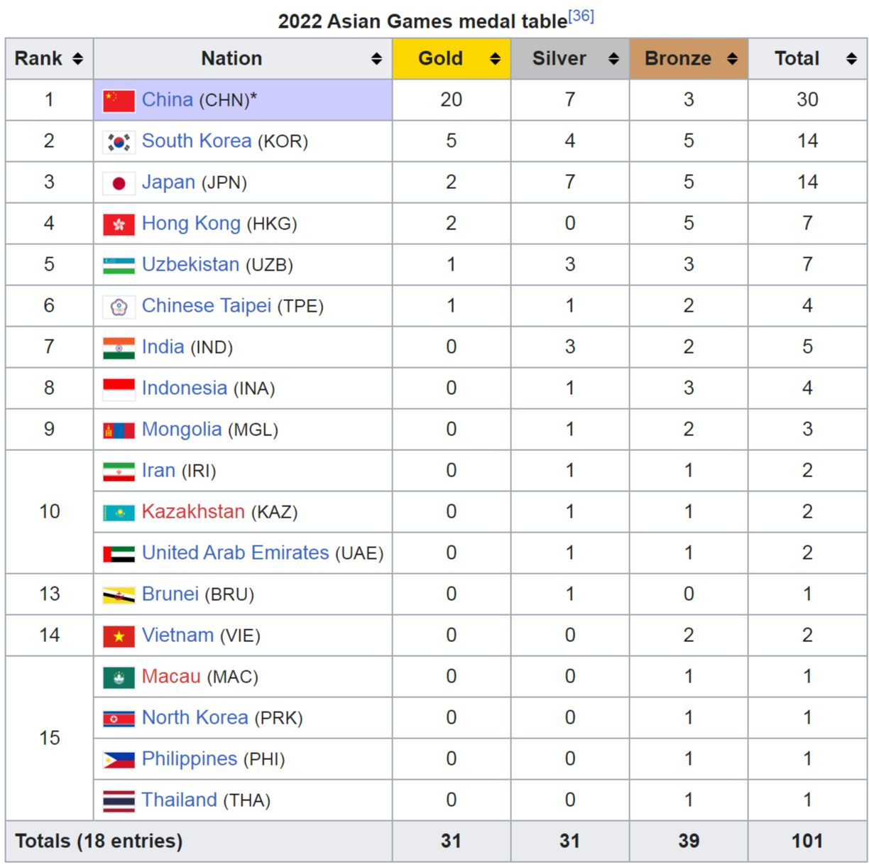 Trong ngày thi đấu đầu tiên (24/9) của Asiad 19 có tổng cộng 31 huy chương Vàng được trao. Chủ nhà Trung Quốc giành được 20 trong số đó. Tiếp theo là Hàn Quốc với 5 huy chương Vàng, Nhật Bản và Hồng Kông (Trung Quốc) có 2, còn Uzbekistan và Đài Bắc Trung Hoa có 1.