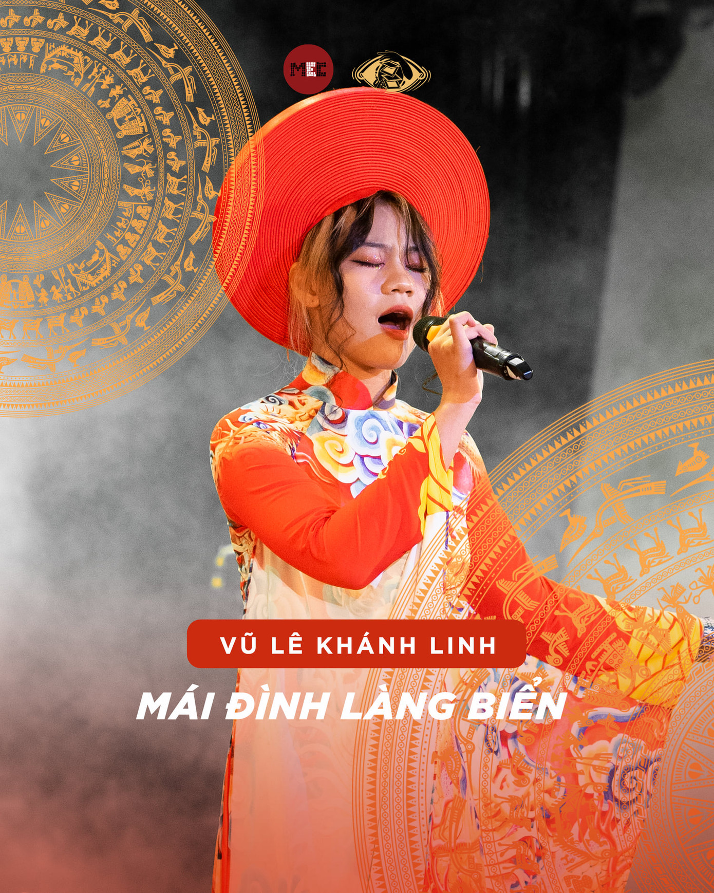 - Chọn cho mình thể loại khác với những "người chơi" còn lại trong top 8, cô nàng Vũ Lê Khánh Linh nổi bật với giọng ca cao vút cùng sân khấu "Mái đình làng biển" mang đậm chất dân gian cổ truyền Việt Nam.