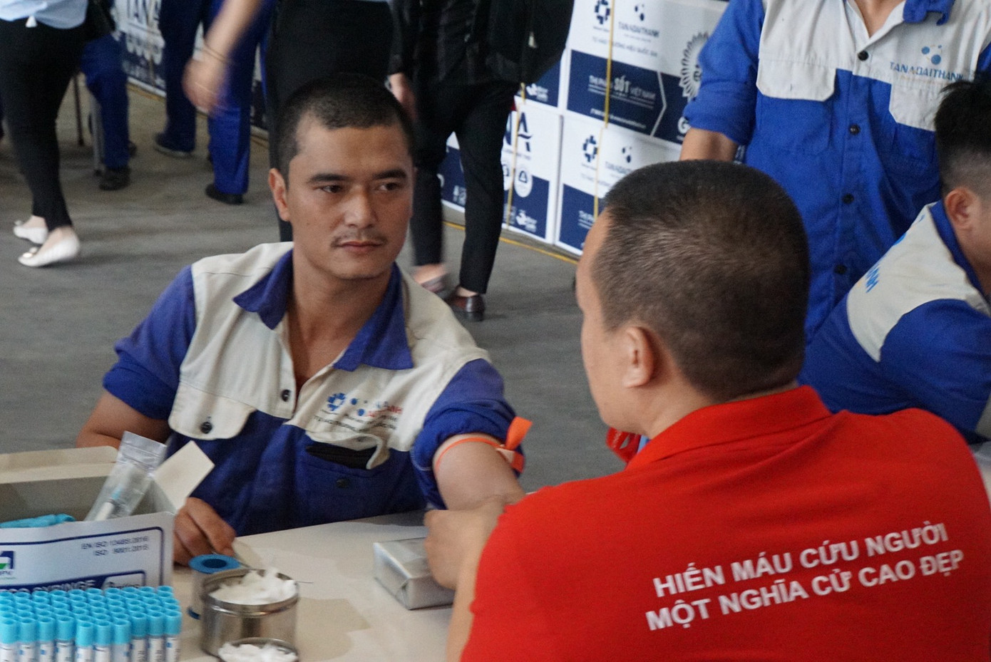| Cán bộ, công nhân viên nhà máy Tân Á Đại Thành Hưng Yên xếp hàng chờ khám sức khoẻ trước khi vào hiến máu. Chương trình hiến máu hôm nay đã thu hút gần 300 cán bộ, công nhân viên của nhà máy tham gia. |