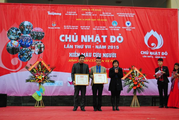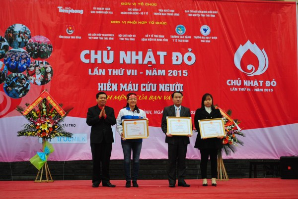 Bà Nguyễn Thị Thu Vân, Ủy viên BCH TƯ Đoàn, Phó Chủ tịch TƯ Hội LHTN Việt Nam thay mặt TƯ Đoàn TNCS Hồ Chí Minh đã trao bằng khen cho 2 tập thể có thành tích xuất sắc trong phong trào hiến máu tình nguyện là Trường ĐH Y dược Thái Bình, Cao đẳng Y tế Thái Bình; Thay mặt ban tổ chức, Nhà báo Vũ Tiến tặng 2 kỷ niệm chương cho các đơn vị đồng tổ chức, trao 2 kỷ niệm chương cho 2 cá nhân có thành tích xuất sắc trong phong trào hiến máu tình nguyện.