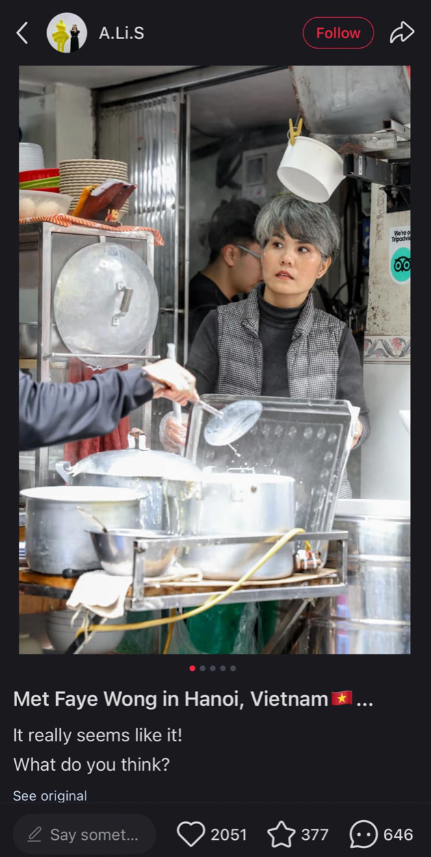 Mới đây, một vị khách du lịch Trung Quốc đăng ảnh chủ một quán phở ở Hà Nội lên mạng xã hội và cho rằng người phụ nữ này rất giống ca sĩ, diễn viên Hồng Kông Vương Phi.