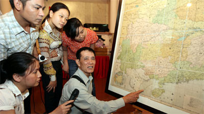 Tiến sĩ Mai Hồng giải thích cho người xem nội dung chữ Hán cổtrên bản đồ của Trung Quốc năm 1904 mà ông đã hiến tặng Bảo tàng Lịch sử quốcgia. Ảnh: TTO