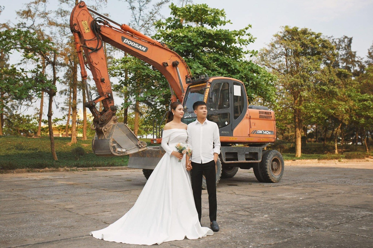 | Chú rể và cô dâu chụp ảnh cưới với máy xúc |