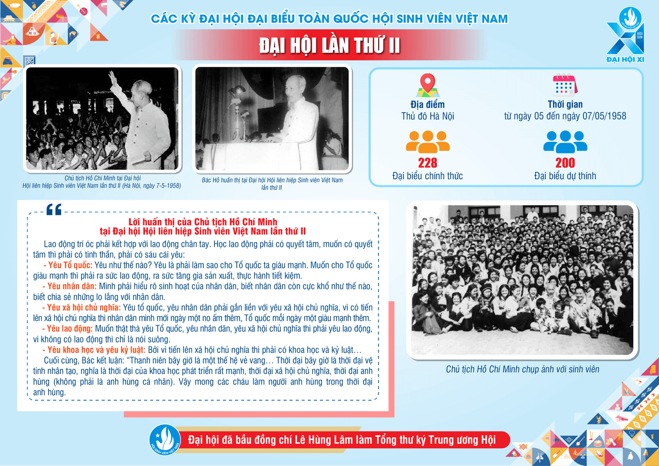 SVO - Diễn ra từ ngày 5 – 7/5/1958, tại Hà Nội, với 228 đại biểu tham dự Đại hội Hội Liên hiệp Sinh viên Việt Nam lần thứ II. Đại hội đón Chủ tịch Hồ Chí Minh đã đến thăm và có lời huấn thị về "6 cái yêu".