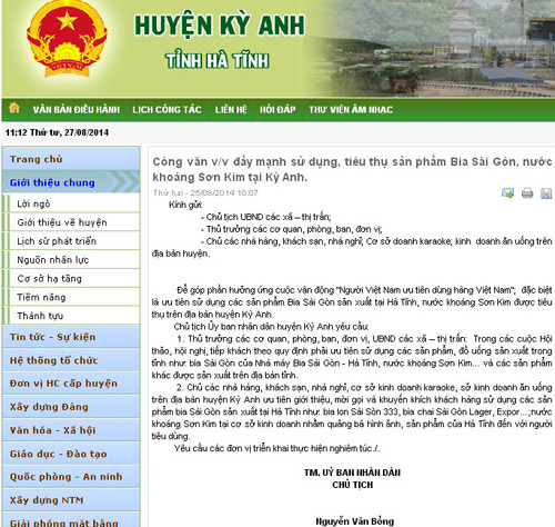 Trong công văn đăng tải ngày 25/8, Chủ tịch UBND huyện Kỳ Anh Nguyễn Văn Bổng yêu cầu thủ trưởng các cơ quan, phòng, ban, đơn vị, UBND các xã, thị trấn, trong những cuộc hội thảo, hội nghị, tiếp khách phải ưu tiên sử dụng sản phẩm, đồ uống sản xuất trong tỉnh như: bia Sài Gòn của Nhà máy Bia Sài Gòn - Hà Tĩnh, nước khoáng Sơn Kim… và các sản phẩm khác được sản xuất trên địa bàn tỉnh.
