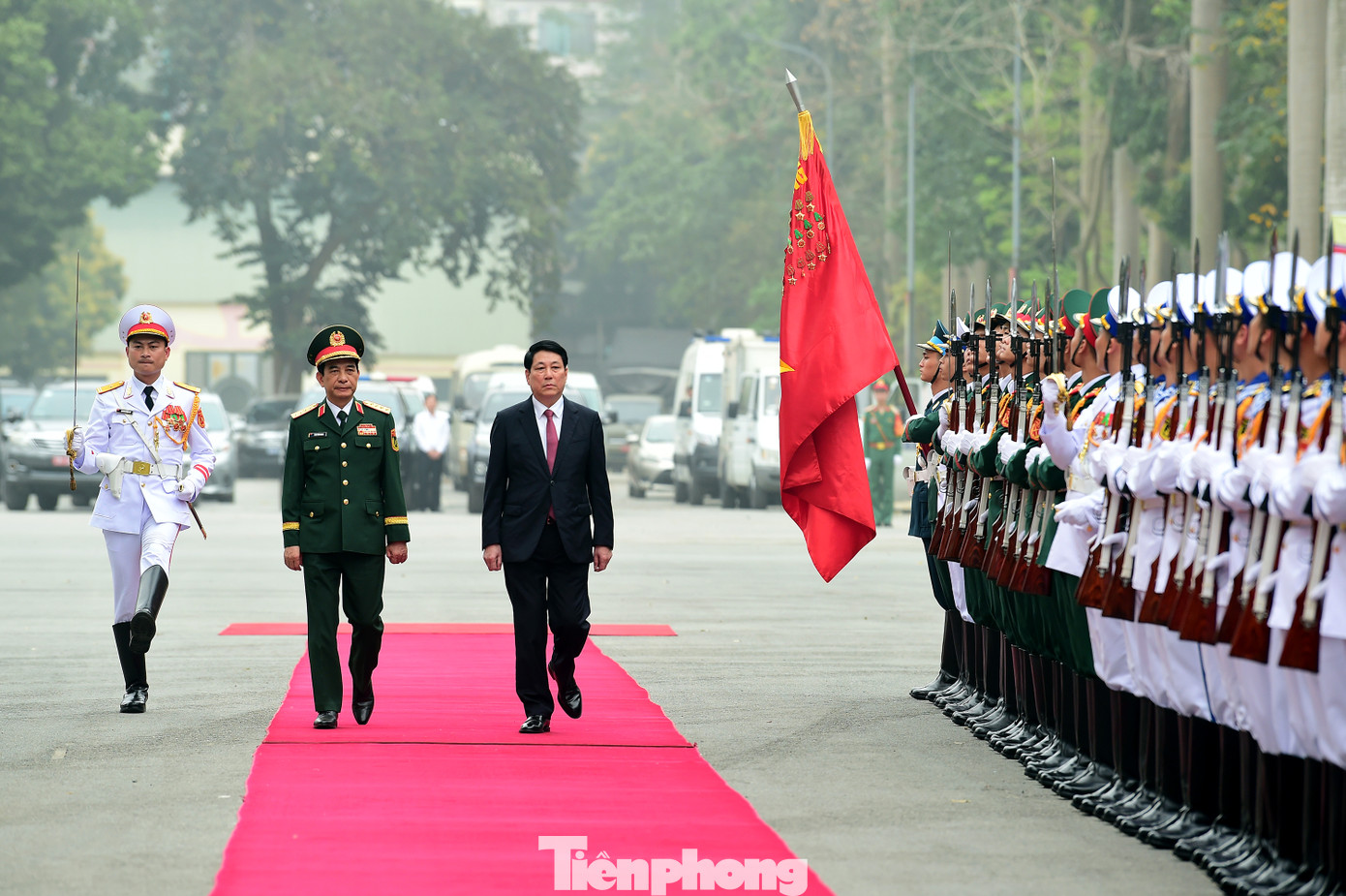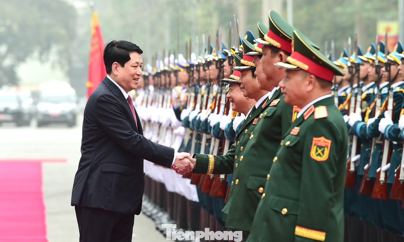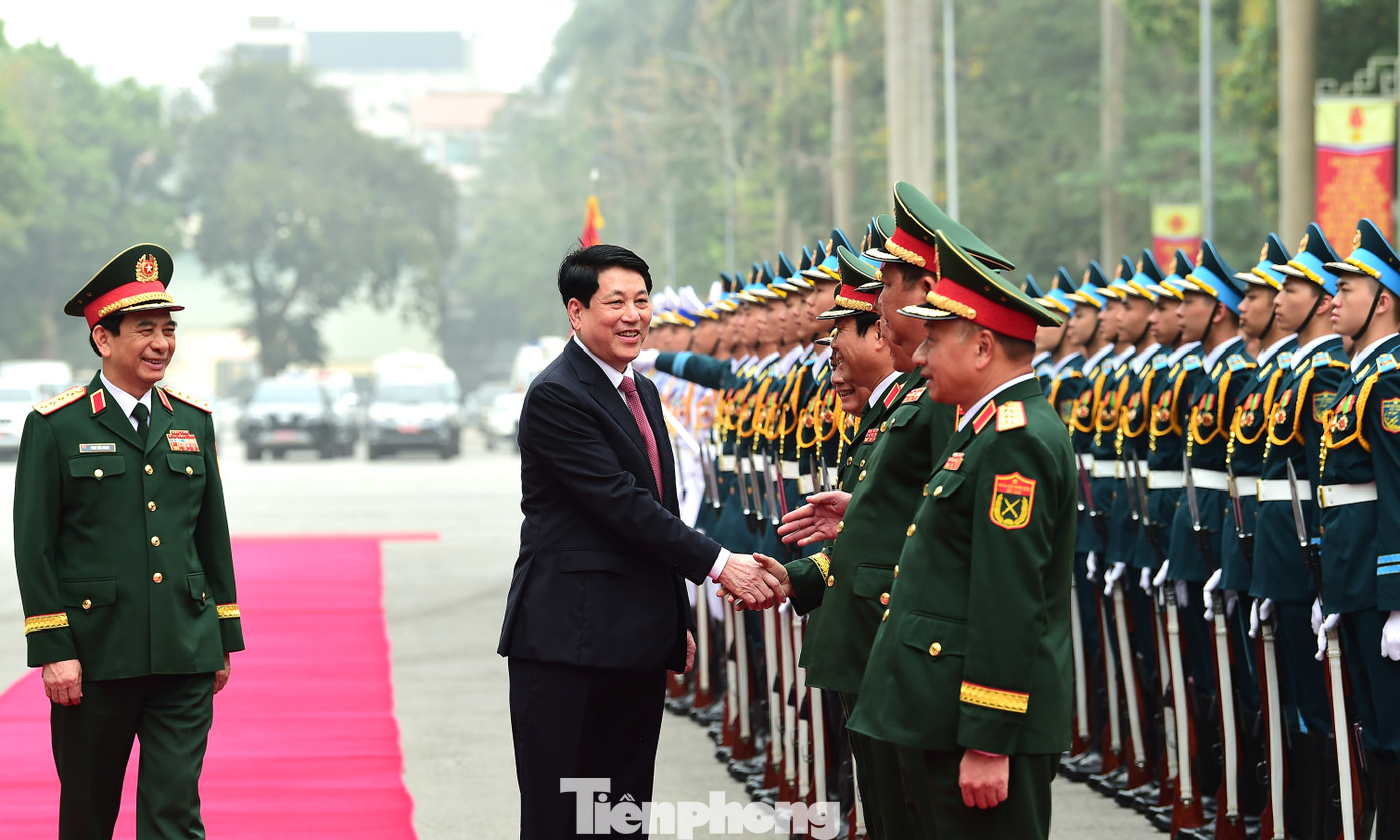 | Chủ tịch nước Lương Cường và các đại biểu dự Lễ kỷ niệm 90 năm Ngày truyền thống Dân quân tự vệ. Ảnh: Xuân Tùng |