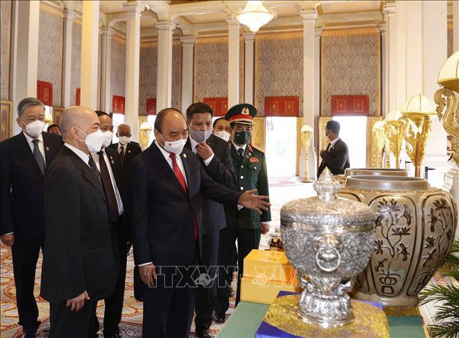 | Chủ tịch nước Nguyễn Xuân Phúc và Quốc vương Campuchia Norodom Sihamoni giới thiệu về quà tặng của hai nước tại Cung điện Hoàng gia. Ảnh: Thống Nhất/TTXVN |