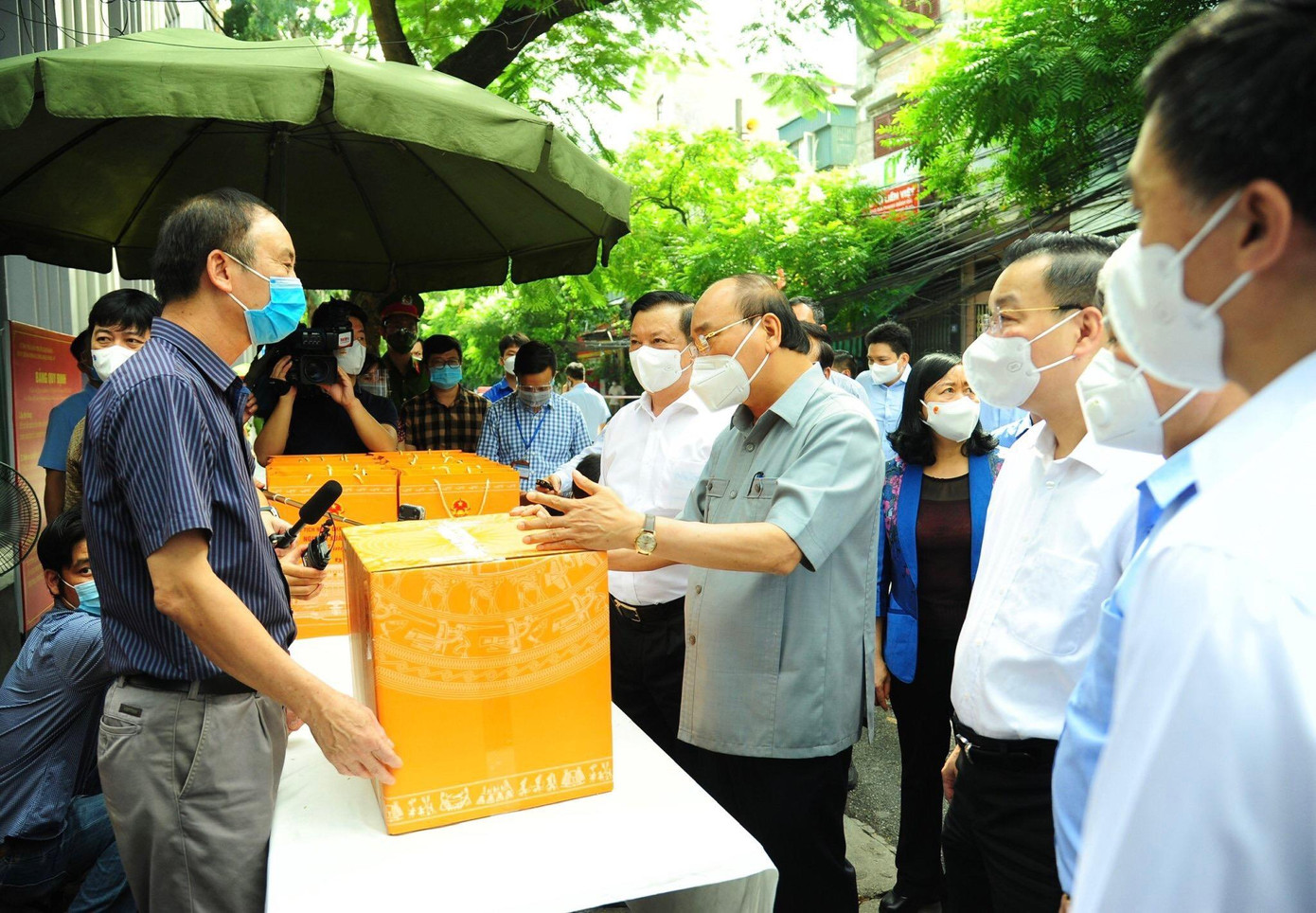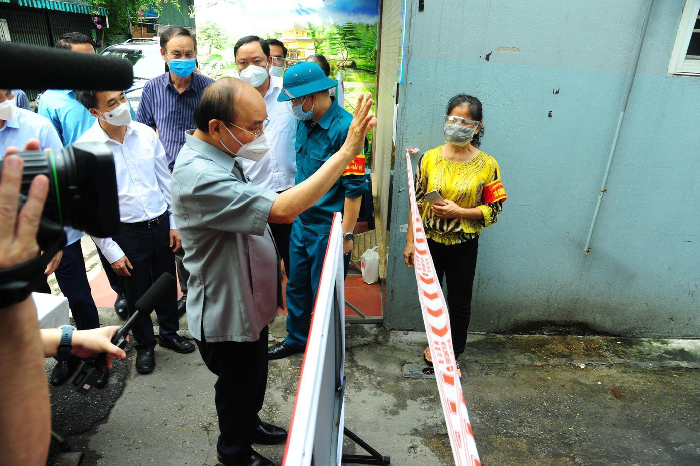Chủ tịch nước Nguyễn Xuân Phúc và đoàn công tác đã tới thăm, động viên nhân dân khu dân cư thực hiện chốt “vùng xanh” tại Khu dân cư số 1, phường Mai Động, quận Hoàng Mai; thăm, tặng quà chốt trực “vùng xanh” tại phường Bạch Đằng, quận Hai Bà Trưng. Chủ tịch nước đề nghị bà con và chính quyền địa phương thực hiện nghiêm giãn cách xã hội; chủ động, tích cực hỗ trợ nhau lúc khó khăn, kiên quyết giữ cho bằng được “vùng xanh” an toàn. Ảnh: Nguyễn Thành