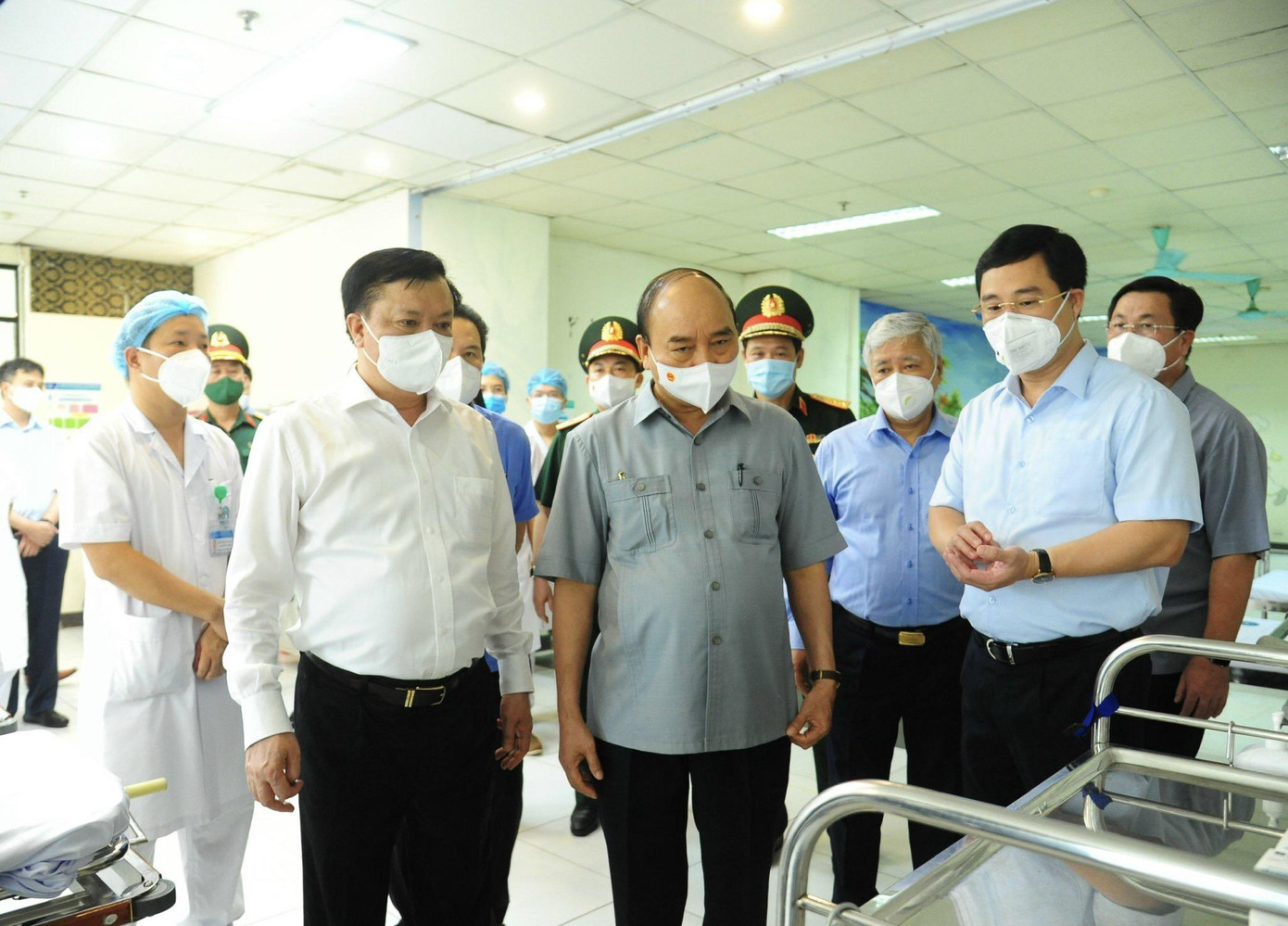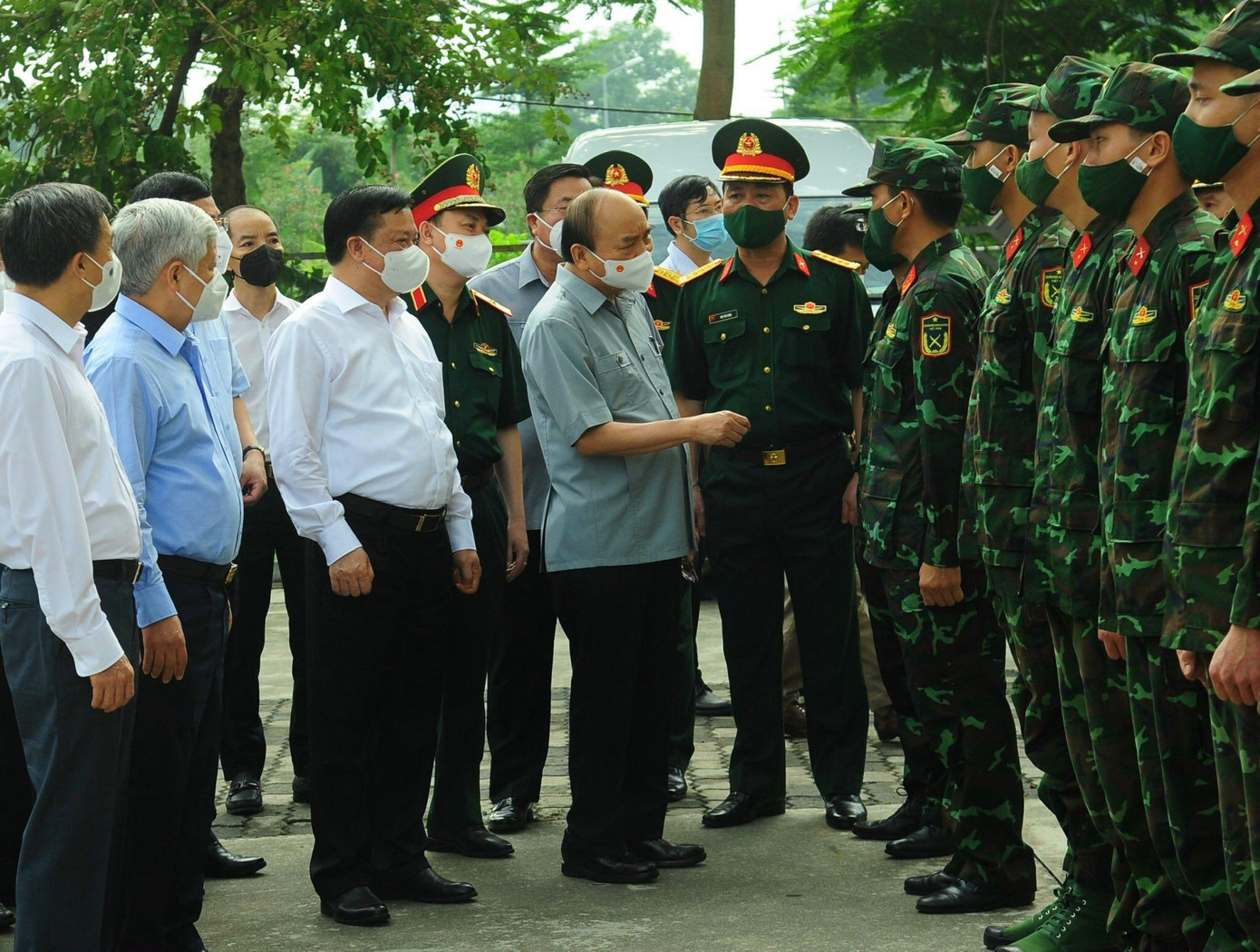 Chủ tịch nước Nguyễn Xuân Phúc thăm, động viên các y, bác sĩ, chiến sĩ quân đội đang làm việc tại cơ sở thu dung, điều trị bệnh nhân COVID-19 ở Khu nhà ở sinh viên Pháp Vân - Tứ Hiệp, quận Hoàng Mai. Ảnh: Nguyễn Thành.