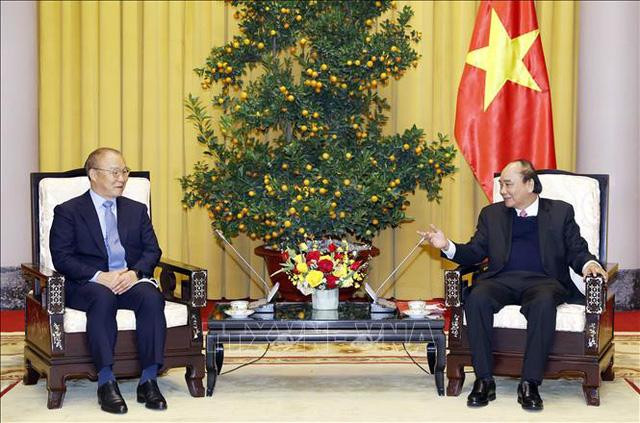 Trong cuộc tiếp đón và nói chuyện thân mật, Chủ tịch nước Nguyễn Xuân Phúc còn tặng món quà lưu niệm cho huấn luyện viên Park Hang-seo.