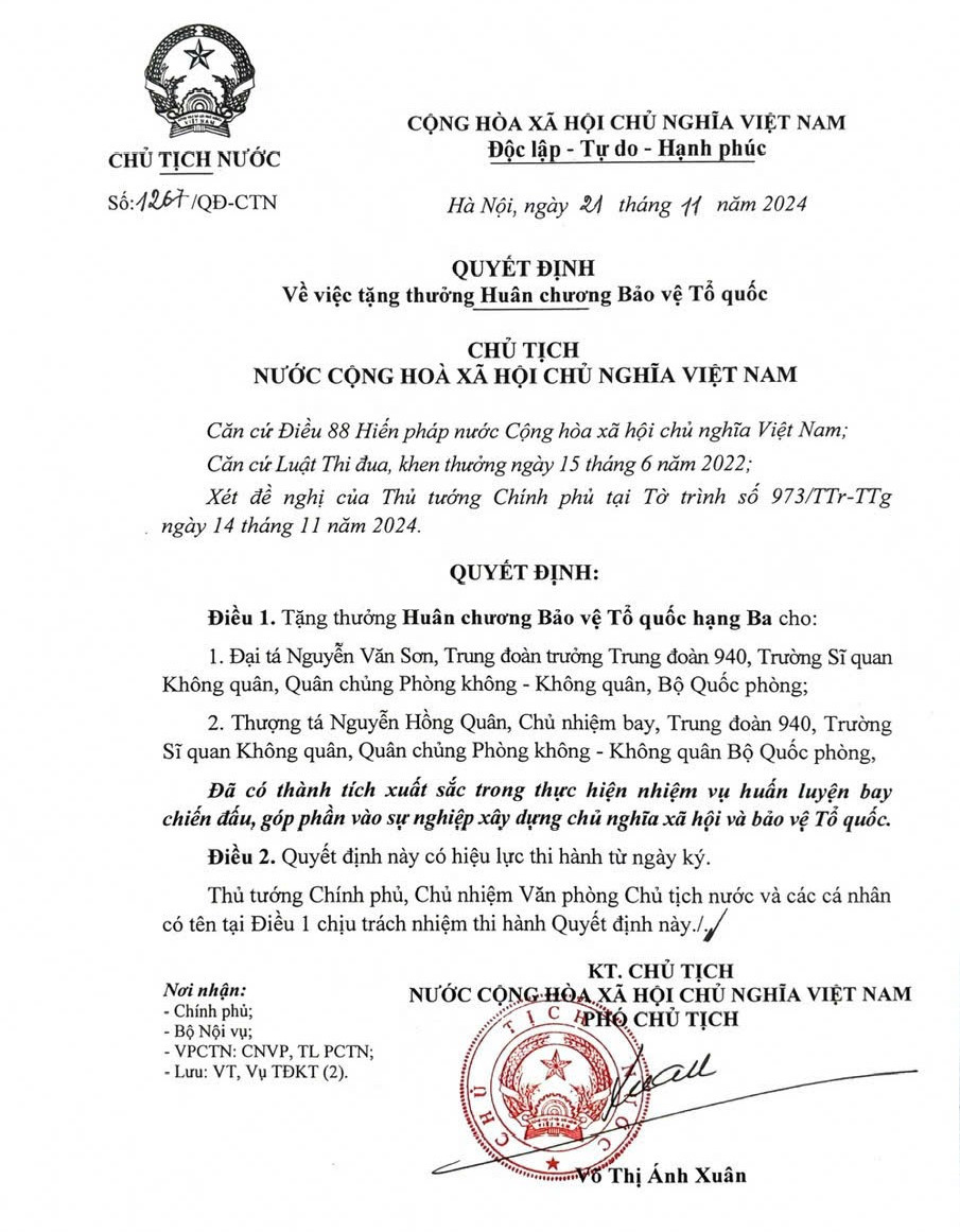 Theo đó, hai sĩ quan được Chủ tịch nước tặng thưởng Huân chương Bảo vệ Tổ quốc hạng Ba là Đại tá Nguyễn Văn Sơn - Trung đoàn trưởng Trung đoàn 940, Trường Sĩ quan Không quân và Thượng tá Nguyễn Hồng Quân - Chủ nhiệm bay, Trung đoàn 940, Trường Sĩ quan Không quân.