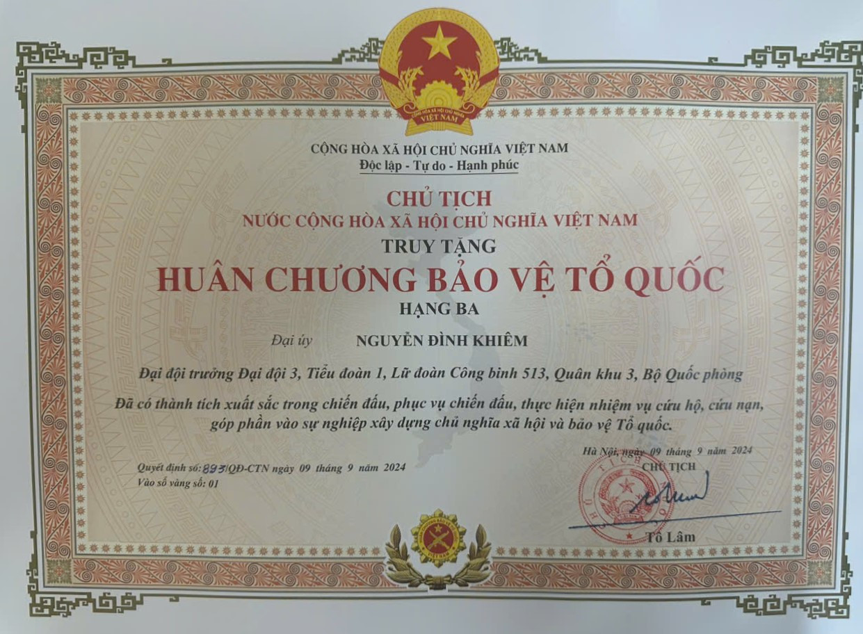 | Theo Ban Thanh niên Quân đội, ngày 9/9, Ban Bí thư Trung ương Đoàn cũng đã có Quyết định truy tặng Huy hiệu “Tuổi trẻ dũng cảm” cho Đại úy Nguyễn Đình Khiêm. |