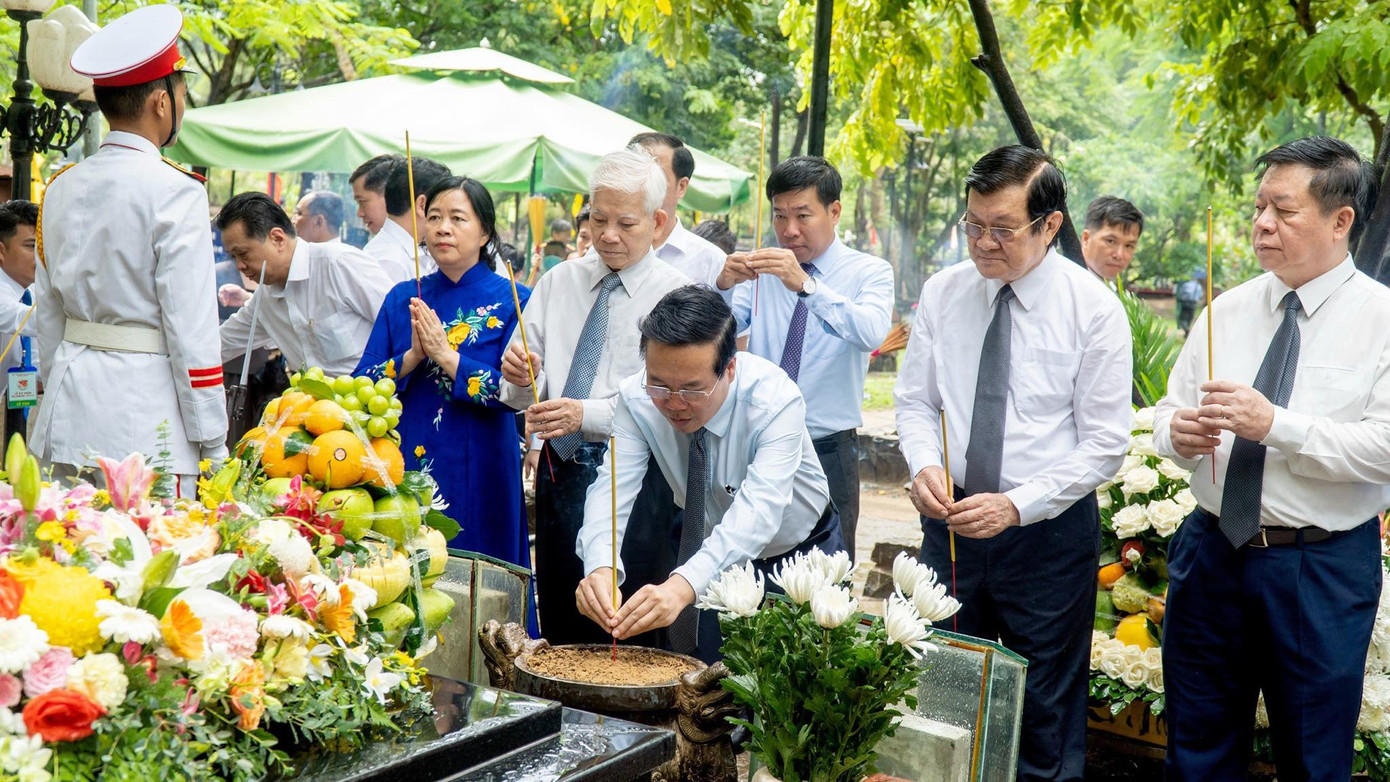 Chủ tịch nước Võ Văn Thưởng và các đại biểu kính cẩn nghiêng mình trước anh linh Tổng Bí thư Lê Hồng Phong; nhà yêu nước Nguyễn An Ninh; Anh hùng Liệt sĩ Võ Thị Sáu và các anh hùng, liệt sĩ.