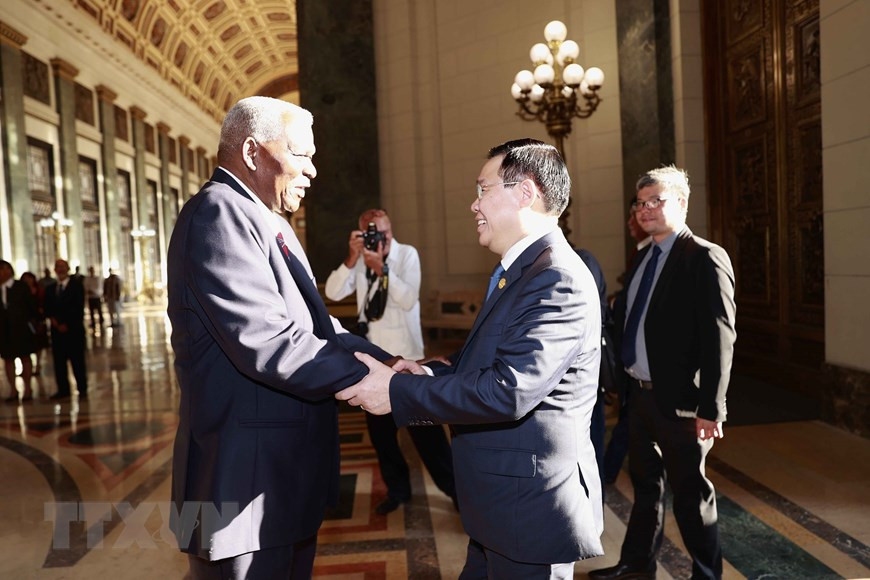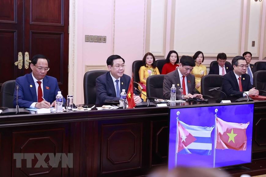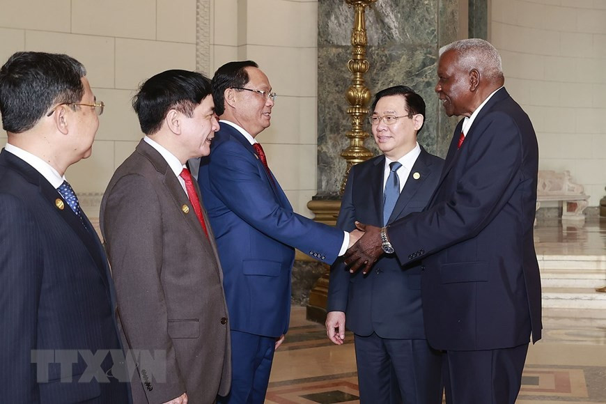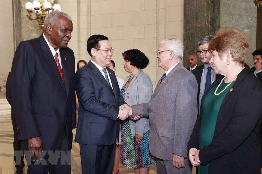 Chủ tịch Quốc hội Vương Đình Huệ giới thiệu đoàn đại biểu Việt Nam với Chủ tịch Quốc hội Chính quyền Nhân dân nước Cộng hòa Cuba Esteban Lazo Hernandez. (Ảnh: Doãn Tấn/TTXVN)