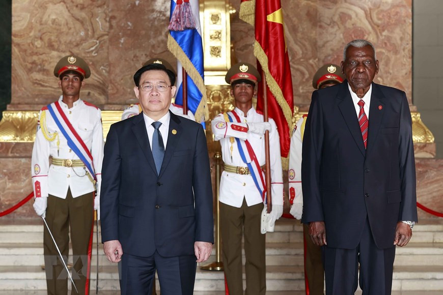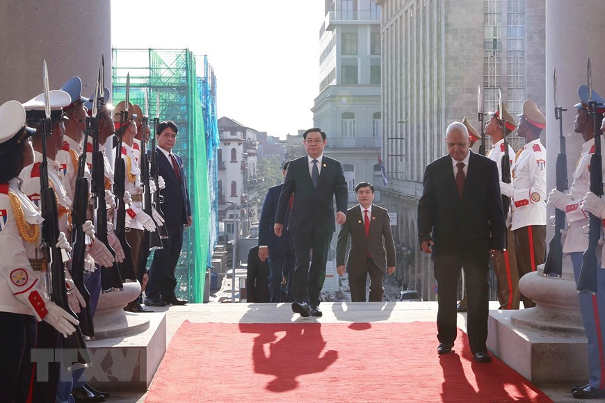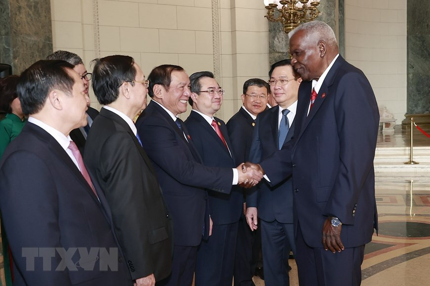 Chủ tịch Quốc hội Chính quyền Nhân dân nước Cộng hòa Cuba Esteban Lazo Hernandez đón Chủ tịch Quốc hội Vương Đình Huệ. (Ảnh: Doãn Tấn/TTXVN)