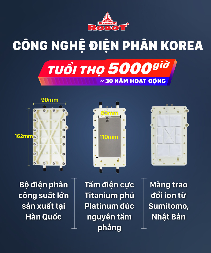 - Máy lọc nước điện giải của chúng tôi được thiết kế từ 3/5/7/9/11/13 tấm điện cực có khả năng tạo từ 7 đến 14 loại nước điện giải và nóng lạnh, pH ~ 3.5-11.0 tùy model. Cũng chính chức năng nóng – lạnh được tích hợp vào máy là tiền đề cho việc xác lập lần lượt Kỷ Lục Châu Á và Thế Giới, chứng nhận đăng ký bản quyền sáng chế quốc tế. Có nghĩa, trên thị trường hiện nay không có loại máy tích hợp chức năng điện giải – nóng thông minh – lạnh trong cùng một sản phẩm như ROBOT. Thêm nữa, dòng máy lọc nước điện giải 13 tấm điện cực cao cấp nhất chính là mấu chốt khác biệt so với phần còn lại, vì hiện nay rất ít thương hiệu sản xuất được máy với bộ điện phân đến 11 tấm điện cực. Để làm được điều này đòi hỏi chúng tôi phải nắm rõ công nghệ kỹ thuật cao hơn, bộ vi mạch công suất lớn mới phân tách tối ưu các nguyên tố khoáng chất trong nước. Hiện tại, các máy lọc nước điện giải ion kiềm ROBOT có chỉ số hydrogen đạt ~ 600 đến ~ 1900 ppb và ORP đạt từ ~ -350 đến ~ -1100 mV (tùy số tấm điện cực của các model máy).