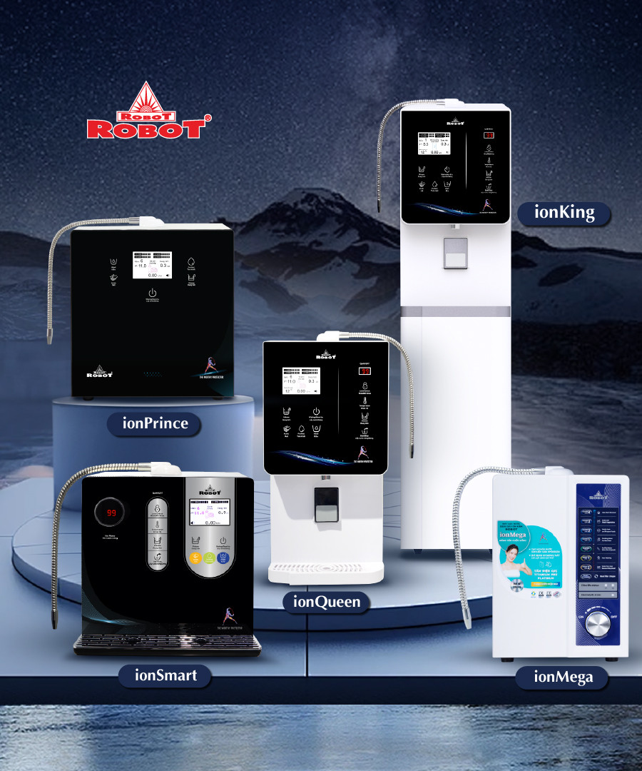 - Hiện nay ROBOT cung cấp các model: ionPrince, ionSmart, ionQueen, ionKing, UHC là sản phẩm có màn hình hỗ trợ giọng nói đa ngôn ngữ và hiển thị chi tiết các thông số của nguồn nước, kiểm soát vận hành tự động,giúp an toàn và tiện ích hơn. Gần nhất ROBOT ra mắt máy lọc nước điện giải ionMega, đây được xem là dòng sản phẩm tiêu chuẩn, giá thành tốt được sản xuất theo định hướng không lợi nhuận mà nhiều người dùng có thể cân nhắc.Các loại máy của chúng tôi đều đạt chuẩn quốc tế về công nghệ và chất lượng, cung cấp đủ loại nước điện giải ion kiềm 24/24 để khách hàng sử dụng với chỉ số Hydrogen, ORP tối ưu.