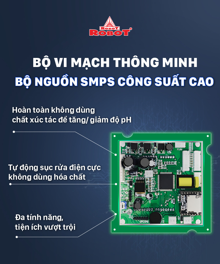 - Lợi thế của tôi là có đội ngũ chuyên môn cao, giàu kinh nghiệm sẵn có từ ngành điện – điện tử và đây cũng là điểm khác biệt. ROBOT đã tự thiết kếcông nghệ vi điều khiển RMC-LCD thông minh, bộ nguồn công suất cao SMPS nâng cấp tiên tiến hơn, điều này có nghĩa, chúng tôi đã kiểm soát công nghệ hoàn toàn. Đối với máy lọc nước, bộ vi mạch cho chức năng kiểm soát chất lượng nước lọc trực tiếp trên màn hình LCD, dễ dàng sử dụng. Với máy lọc nước điện giải ion kiềm chúng tôi nghiên cứu sáng chế các kiểu dáng, chức năng tiện ích vượt trội, nâng tầm và khác biệt so với các dòng máy truyền thống, ROBOT cũng đã đạt Kỷ lục Châu Á và Thế Giới về các dòng máy lọc nước & máy điện giải ion kiềm.