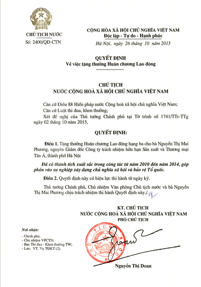 Vào ngày 26 tháng 10 năm 2015 vừa qua, Chủ tịch Hội đồng Quản trị của Tập đoàn Tân Á Đại Thành đã vinh dự được Nhà nước trao tặng Huân chương lao động hạng 3 vì những cống hiến to lớn của mình, đóng góp vào sự nghiệp xây dựng chủ nghĩa xã hội Việt Nam. Đây là phần thưởng vô cùng cao quý của Đảng và Nhà nước trao tặng cho bà Nguyễn Thị Mai Phương và cũng là niềm vinh dự lớn của Tập đoàn Tân Á Đại Thành.