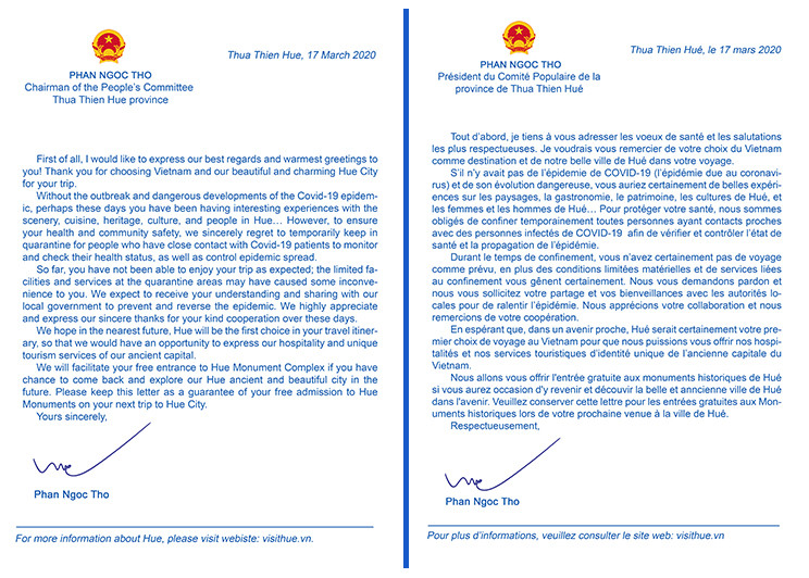Ngày 17/3, Chủ tịch UBND tỉnh Phan Ngọc Thọ đã có thư gửi đến tất cả du khách đến TT-Huế du lịch nhưng tạm thời bị cách ly do lo ngại lây lan dịch Covid-19. Đồng thời mong muốn được đón du khách vào thời điểm khác.