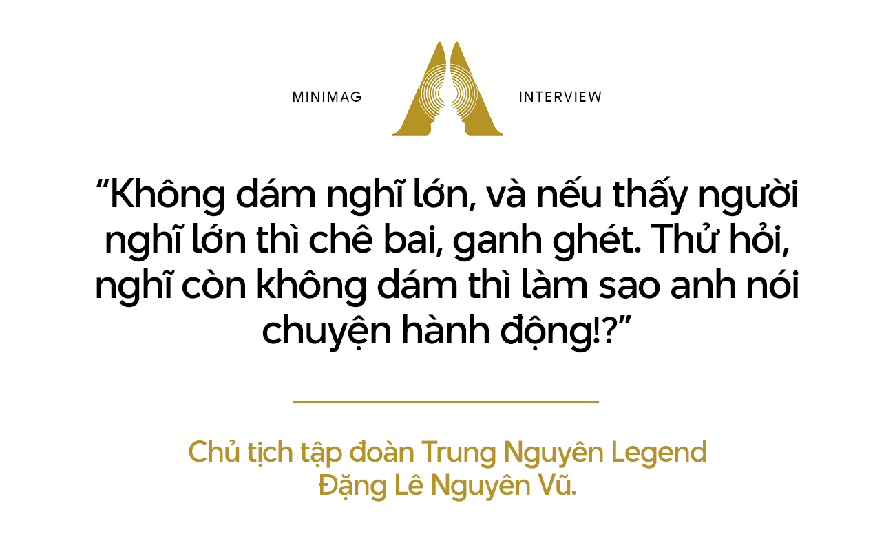 Ông Đặng Lê Nguyên Vũ từng nói: “Không dám nghĩ lớn, và nếu thấy người nghĩ lớn thì chê bai, ganh ghét. Thử hỏi, nghĩ còn không dám thì làm sao anh nói chuyện hành động!?”. Phải chăng đây là lý do Tập đoàn Trung Nguyên Legend kiên trì thực hiện cách tiếp cận đặc biệt trên trong công cuộc “Hành trình từ trái tim”?