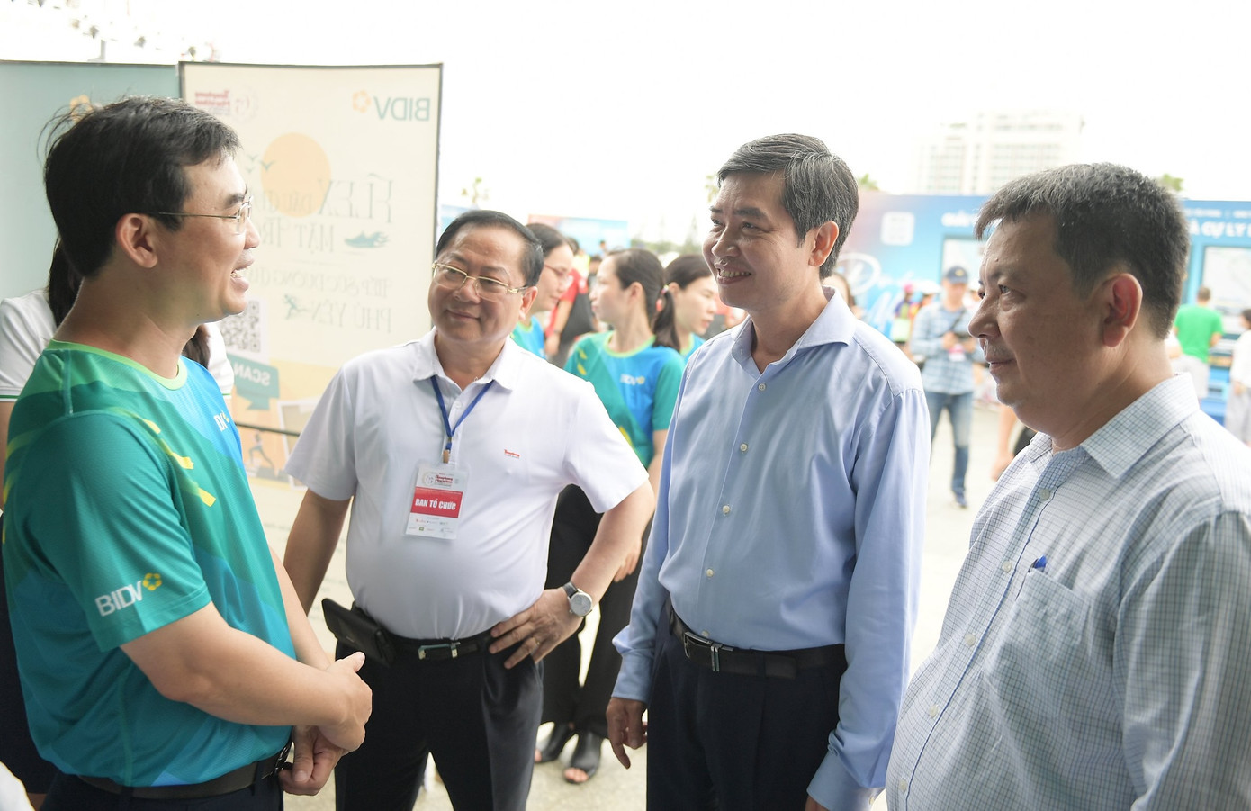 Chủ tịch UBND tỉnh Phú Yên Tạ Anh Tuấn cũng đến các gian hàng, giao lưu, chụp hình và trao đổi với cán bộ, nhân viên các đơn vị tài trợ Tiền Phong Marathon 2024.