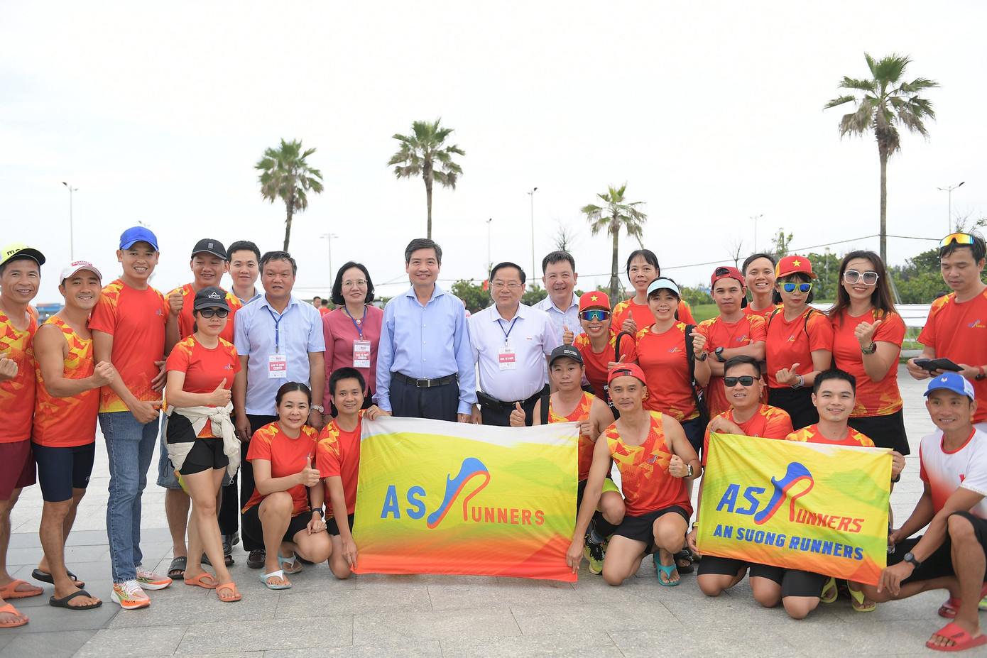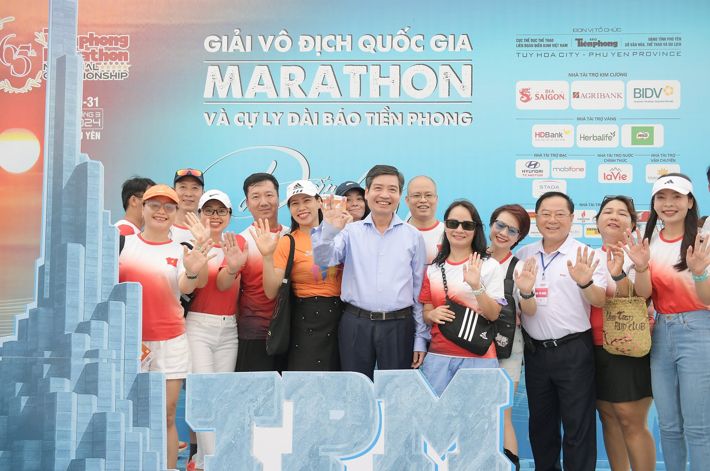 Tại đây, Chủ tịch UBND tỉnh Phú Yên Tạ Anh Tuấn đã gặp gỡ, chụp hình lưu niệm với các câu lạc bộ chạy bộ tham gia Tiền Phong Marathon 2024.