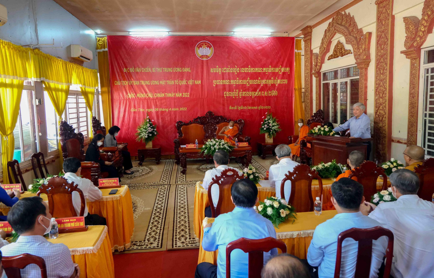 | Chủ tịch Ủy ban Trung ương MTTQ Việt Nam Đỗ Văn Chiến tặng quà, chúc Tết cổ truyền Chôl Chnăm Thmây tại Cần Thơ. |
