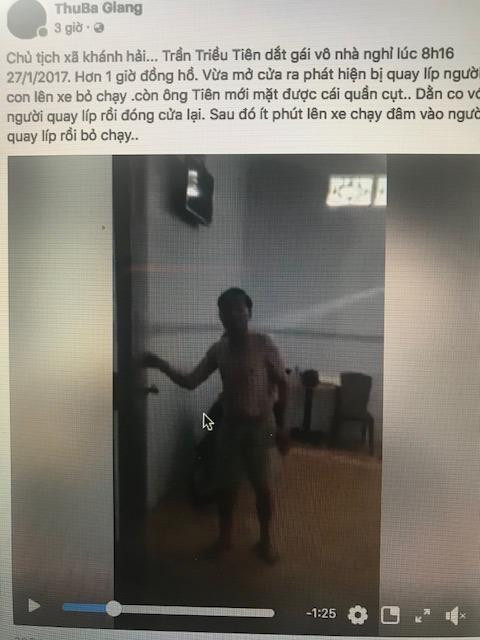 Người này nói phát hiện ông Tiên cùng cô goá phụ trẻ, bán cà phê ở gần trụ sở xã Khánh Hải, vào phòng Nhà nghỉ Phúc Linh, ở Kinh Hãn, xã Khánh Hải, lúc 8 giờ 16 phút ngày 27/1/2017.