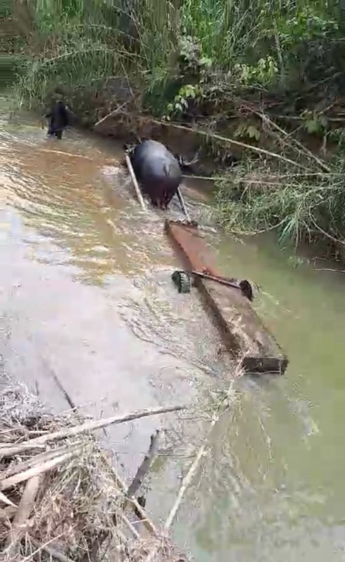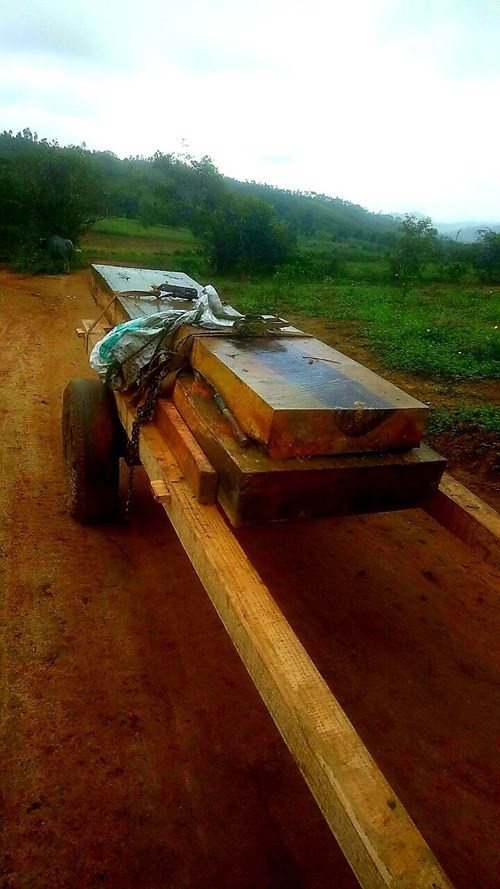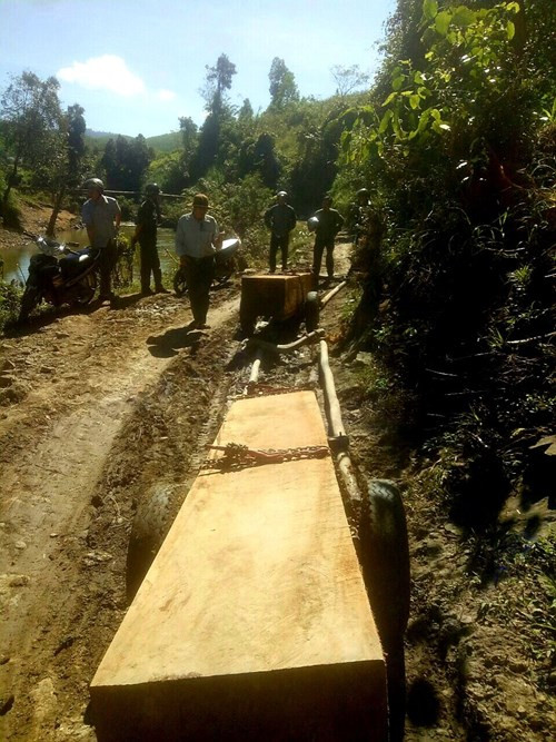 Ngay sau đó, đội cơ động của xã (gồm công an, dân quân tự vệ) do ông Nguyễn Văn Vỹ (Chủ tịch UBND xã Cư Bông) dẫn đầu đã tiếp cận hiện trường, bắt giữ 2 xe công nông độ chế với khối lượng gỗ 11,7m3 gỗ. Khi bị lực lượng chức năng phát hiện, các đối tượng bỏ lại tang vật và phương tiện để tẩu thoát. Ngày 18/3, lực lượng của xã phối hợp với các đơn vị nghiệp vụ của huyện đưa toàn bộ số gỗ tang vật cùng phương tiện về trụ sở UBND xã Ea Bông để chờ xử lý theo đúng quy định. Trong ảnh: Dùng xe trâu kéo gỗ ra khỏi rừng