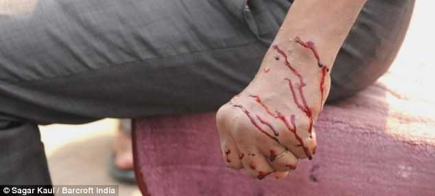 Sau đó, bệnh nhân đứng thẳng, được buộc chặt dây thừng từ thắt lưng trở xuống và được rạch máu bằng dao cạo.