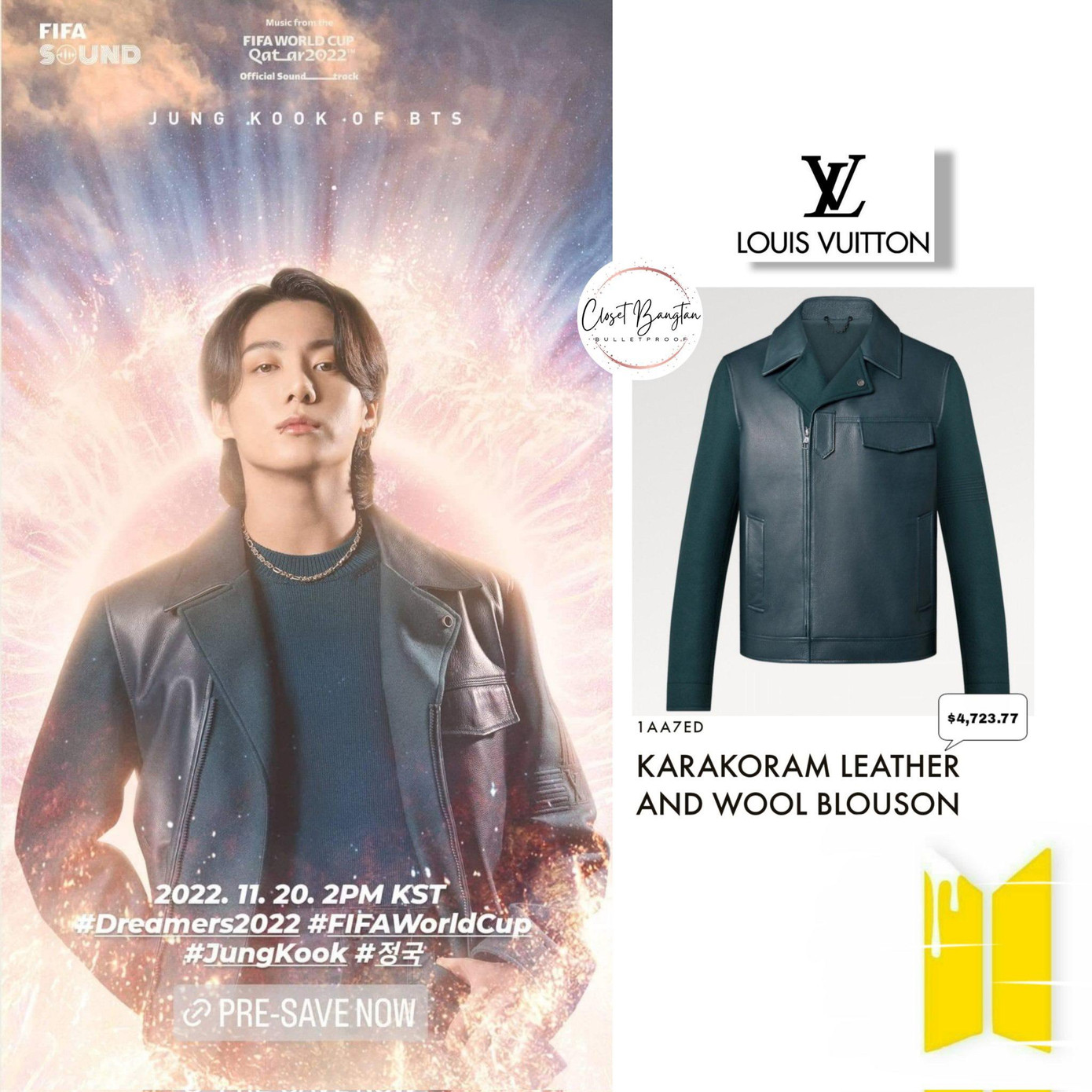 Nhưng Jungkook cũng "không quên" Louis Vuitton khi nam thần tượng đã diện mẫu áo khoác da có giá 4,723$ (tương đương 117 triệu đồng) trong poster giới thiệu ca khúc Dreamers được tiết lộ trước khi biểu diễn.