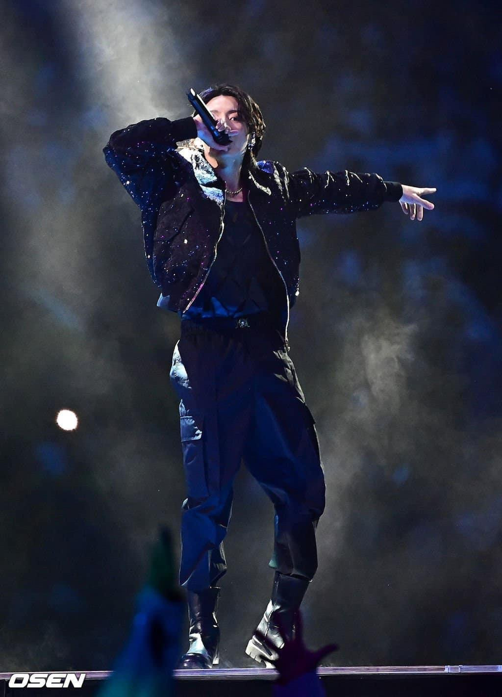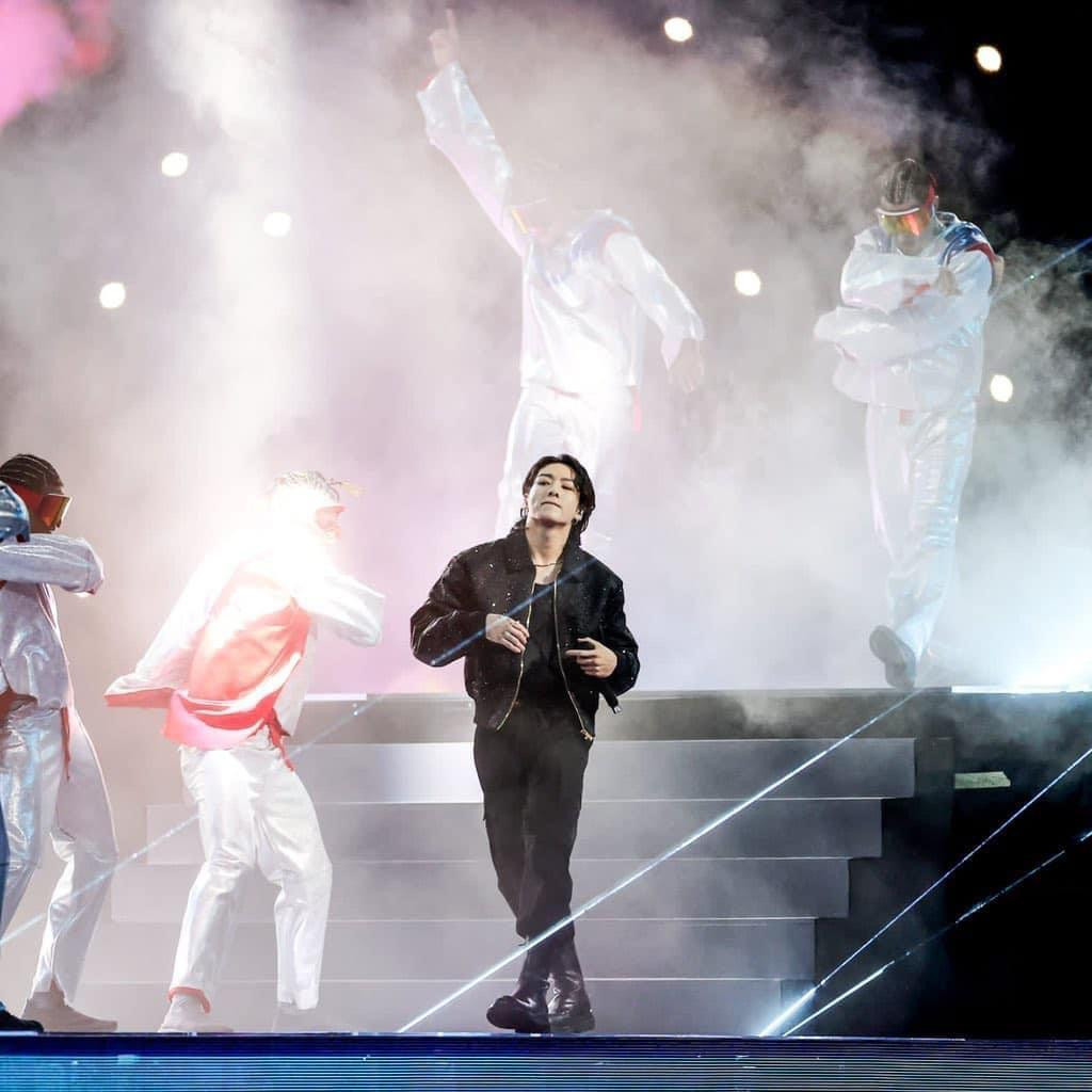 Được bao quanh bởi các vũ công hỗ trợ, Jungkook đã thu hút đám đông bằng sức hút và tài năng thanh nhạc đáng kinh ngạc của mình. Màn trình diễn cảm động đã diễn ra suôn sẻ khi Jungkook thể hiện một sân khấu đẳng cấp thế giới một cách vô cùng tận hưởng.