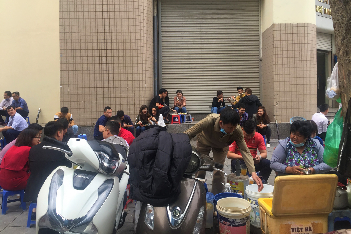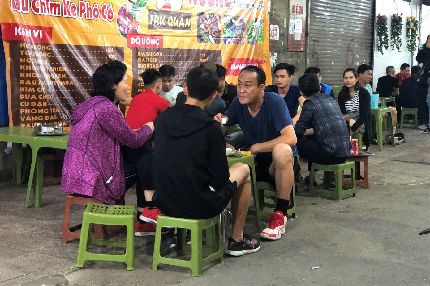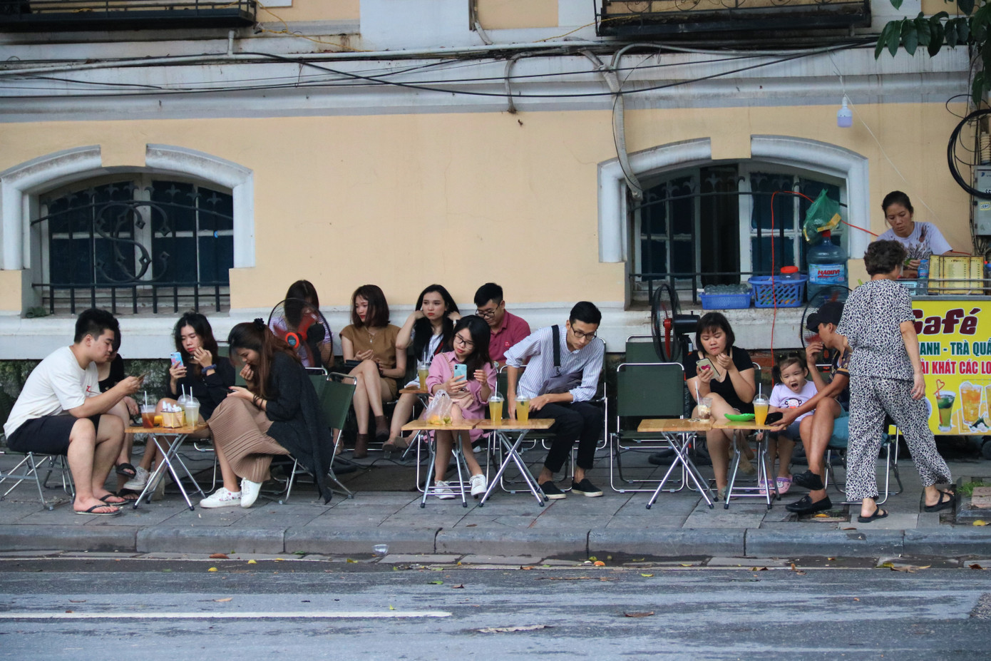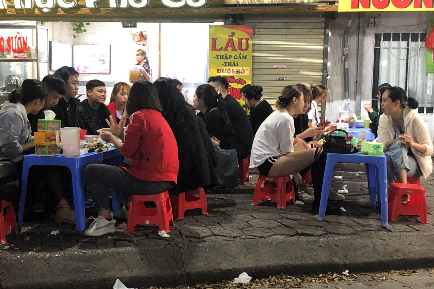 Không chỉ các quán nước, các quán ăn trên vỉa hè cũng đông đúc người với khoảng cách sát nhau.