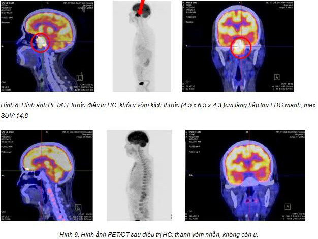 Các xét nghiệm cận lâm sàng công thức máu, chức năng gan thận và chất chỉ điểm u trong giới hạn bình thường… Hình ảnh nội soi TMH sau điều trị hóa chất không thấy u. Hình ảnh PET/CT sau điều trị hóa chất cho thấy thành vòm nhẵn, không còn u. Các cơ quan bộ phận khác không thấy dấu hiệu di căn.